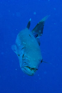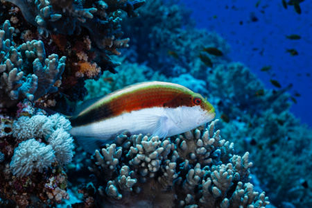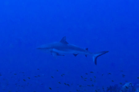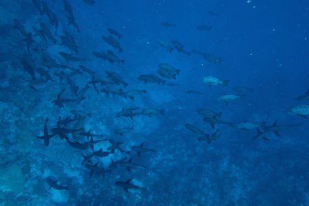 Wir wachen am Big Brother ankernd auf. (um 5 Uhr, um auch die ersten im Wasser zu sein…) Ich tauche mit dem Weitwinkelobjektiv, da ich am Vortag festgestellt habe, dass viele Fotos sehr unscharf waren und ich mich mit dem Weitwinkel wohler fühle. Der erste Tauchgang geht in den Südosten, am Anfang ist nur viel Blau zu sehen, dann entdecken wir aber einen Weißspitzenriffhai in der Ferne. Am Riff sind dann wieder viele bunte Fische, aber wir sehen auch Barracudas und einen Napoleon-Lippfisch.