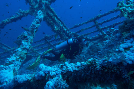 Nach dem Frühstück wird gerastet, dann geht es in den Nordwesten zum Wrack Numidia. Dieses konnten wir letztes Mal nicht betauchen, da zu viel Strömung war. Doch diesmal klappt alles, wir tauchen auch ins Wrack hinein, draußen ist es sehr bewachsen, da es schon seit 100 Jahren hier liegt. Am Rückweg haben wir wieder vbF, die Brothers sind ja immerhin eins der schönsten Riffe überhaupt. Wir sehen wieder Barracudas und Makrelenschwärme.