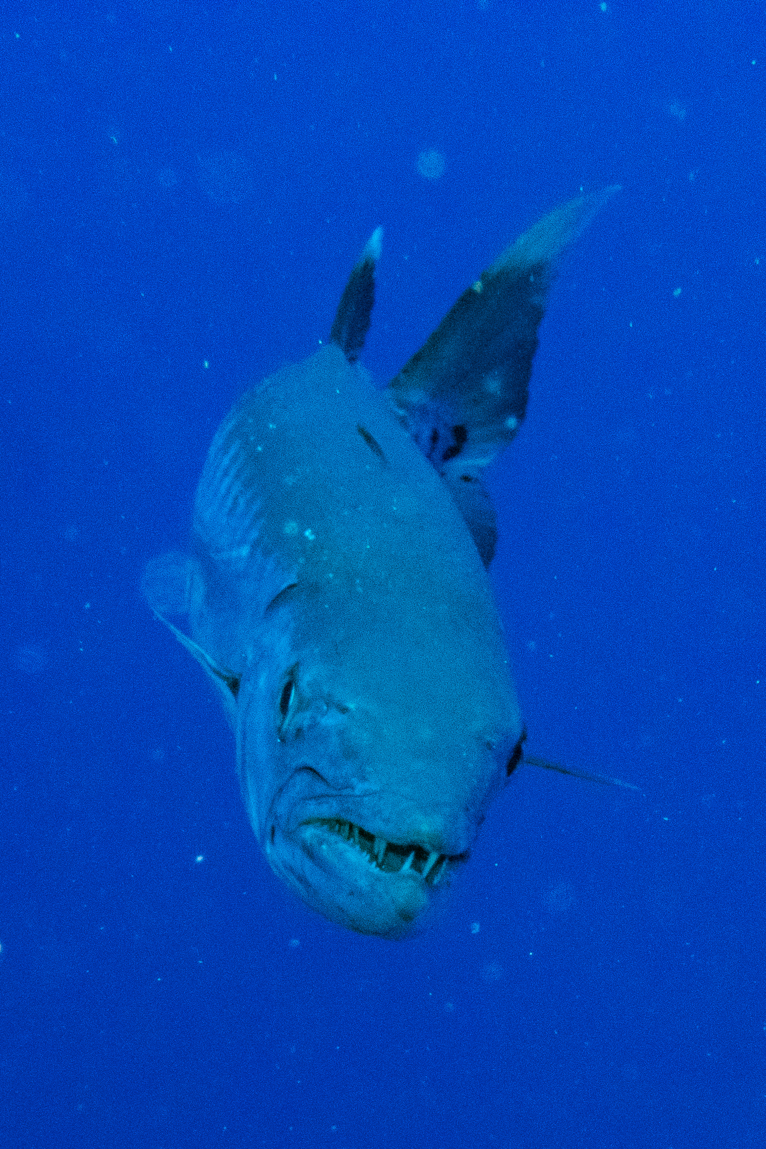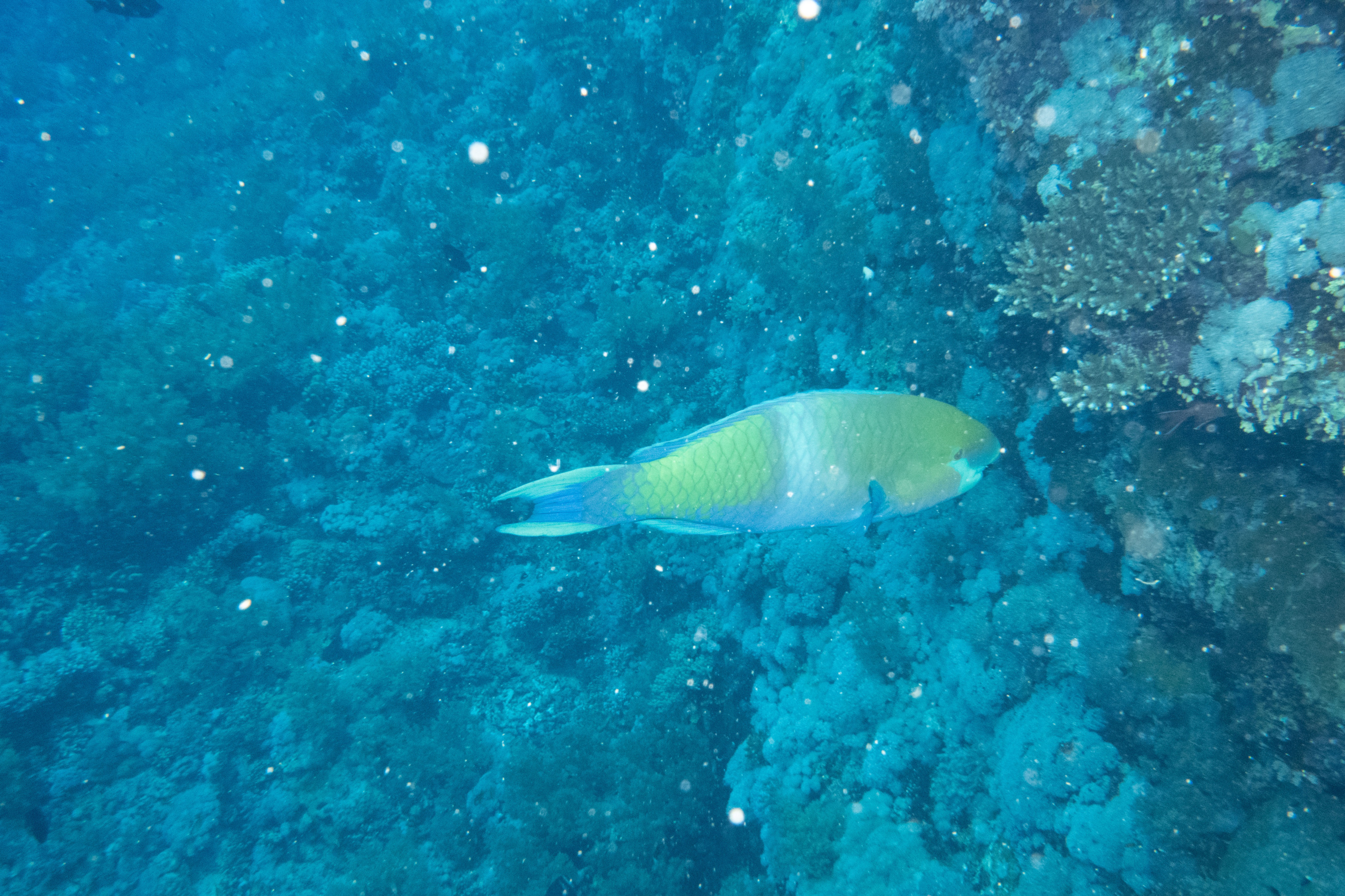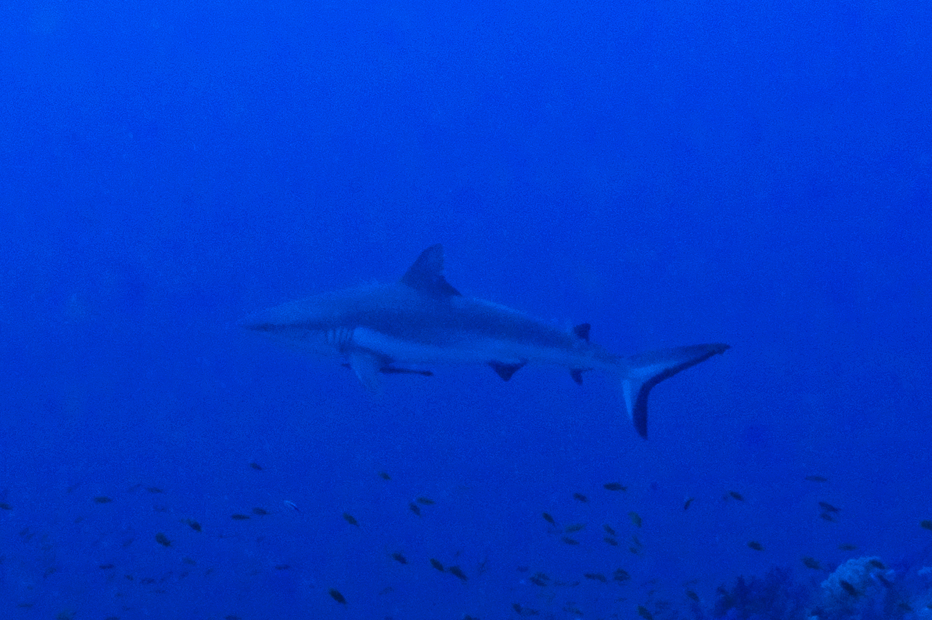 Wir wachen am Big Brother ankernd auf. (um 5 Uhr, um auch die ersten im Wasser zu sein…) Ich tauche mit dem Weitwinkelobjektiv, da ich am Vortag festgestellt habe, dass viele Fotos sehr unscharf waren und ich mich mit dem Weitwinkel wohler fühle. Der erste Tauchgang geht in den Südosten, am Anfang ist nur viel Blau zu sehen, dann entdecken wir aber einen Weißspitzenriffhai in der Ferne. Am Riff sind dann wieder viele bunte Fische, aber wir sehen auch Barracudas und einen Napoleon-Lippfisch.