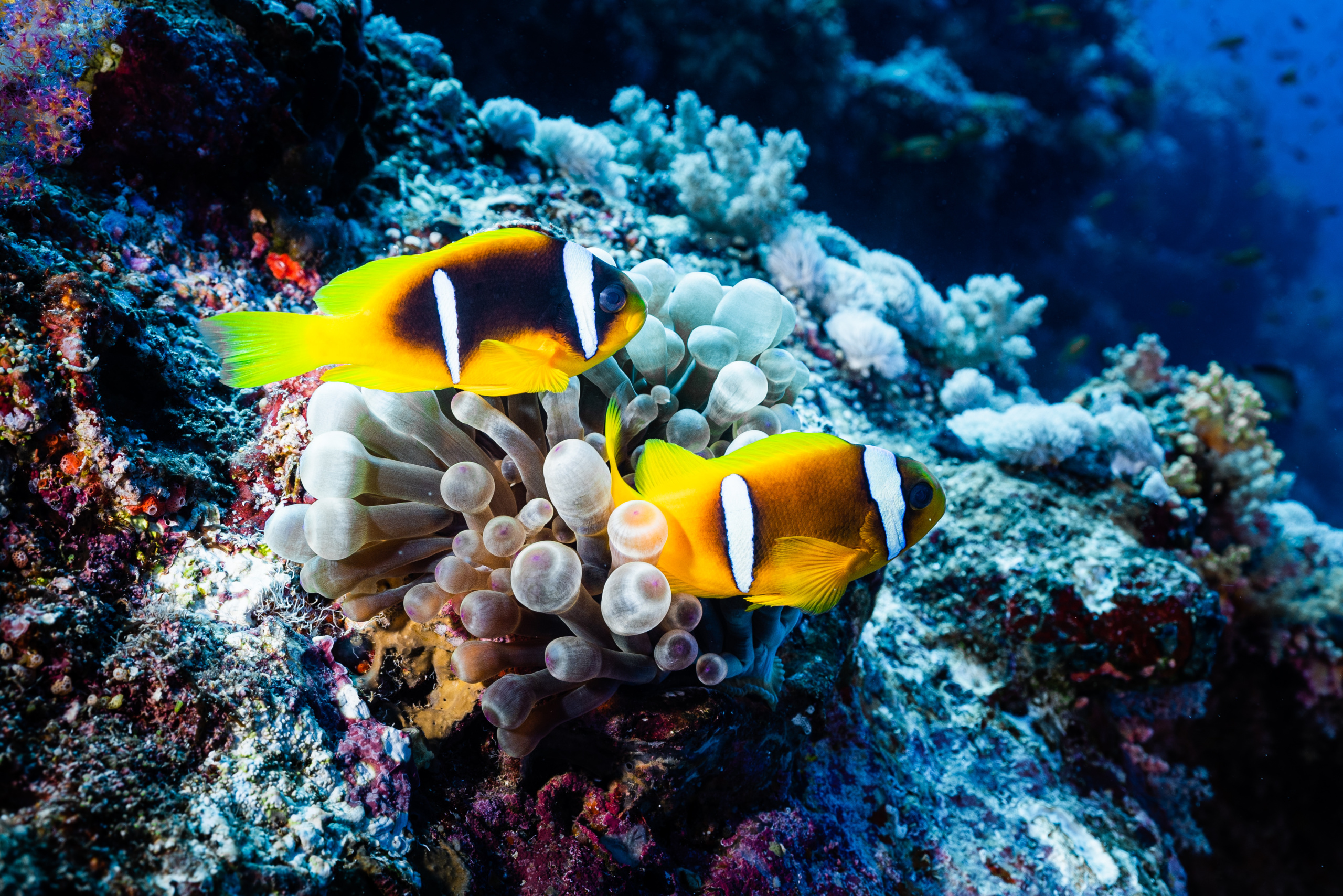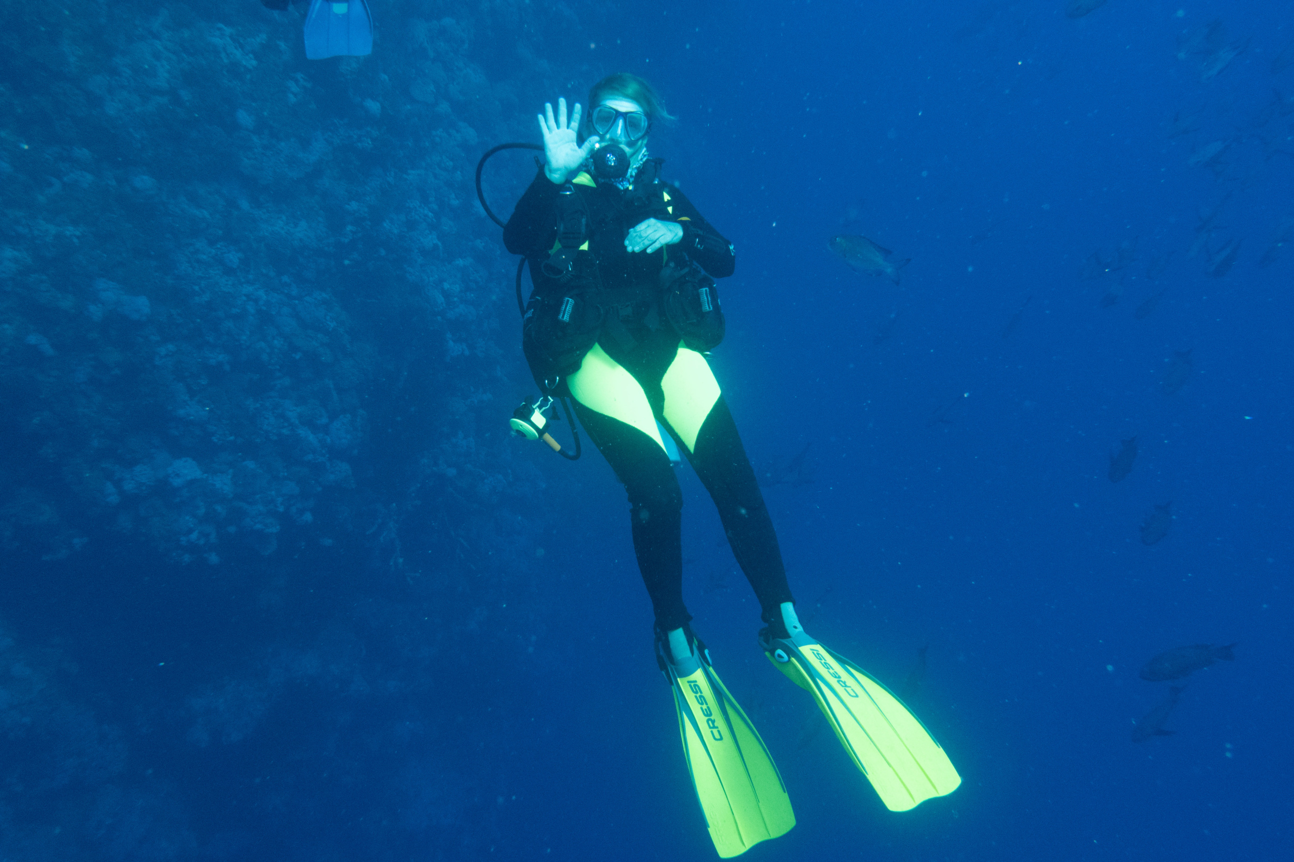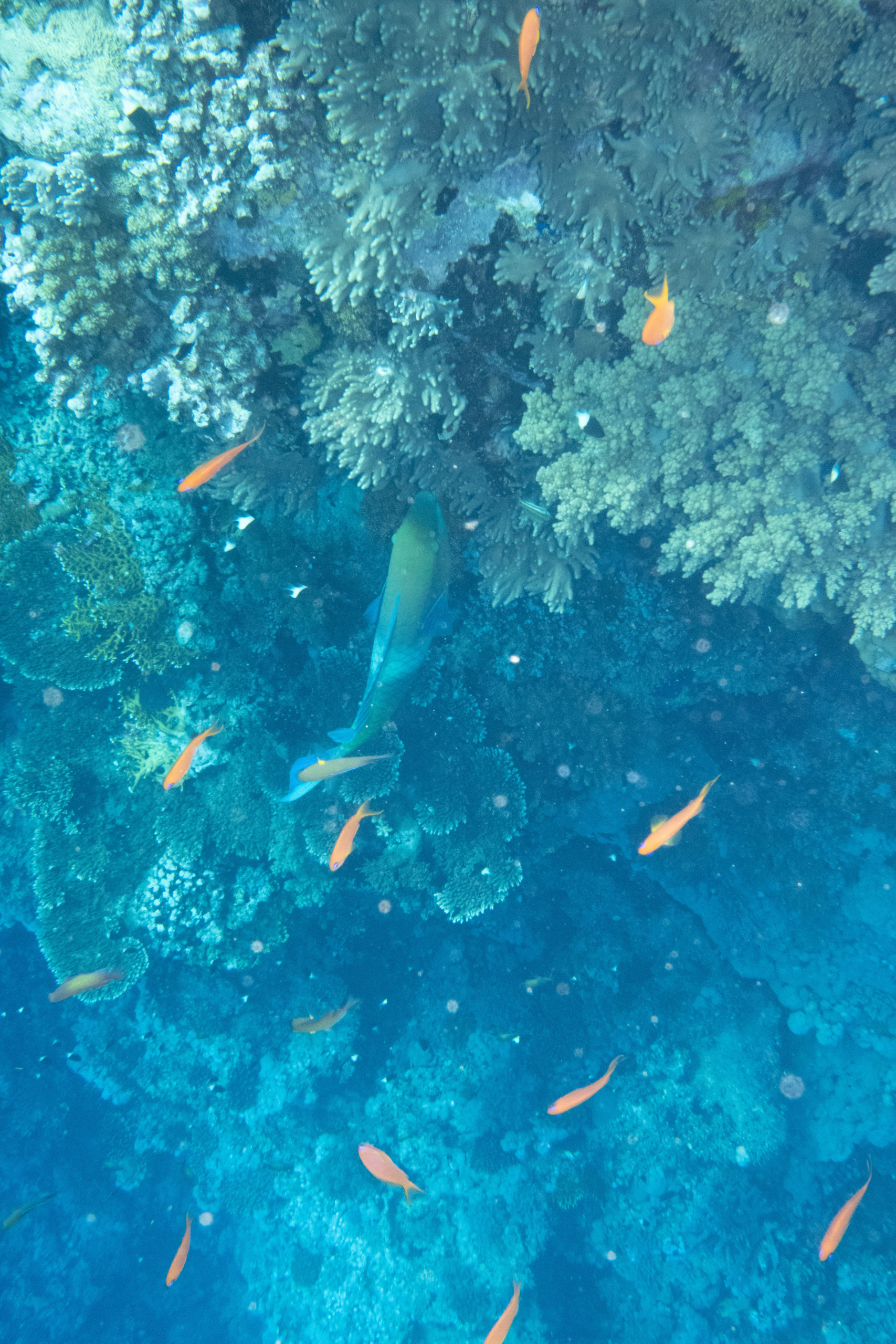 Wir wachen am Big Brother ankernd auf. (um 5 Uhr, um auch die ersten im Wasser zu sein…) Ich tauche mit dem Weitwinkelobjektiv, da ich am Vortag festgestellt habe, dass viele Fotos sehr unscharf waren und ich mich mit dem Weitwinkel wohler fühle. Der erste Tauchgang geht in den Südosten, am Anfang ist nur viel Blau zu sehen, dann entdecken wir aber einen Weißspitzenriffhai in der Ferne. Am Riff sind dann wieder viele bunte Fische, aber wir sehen auch Barracudas und einen Napoleon-Lippfisch.