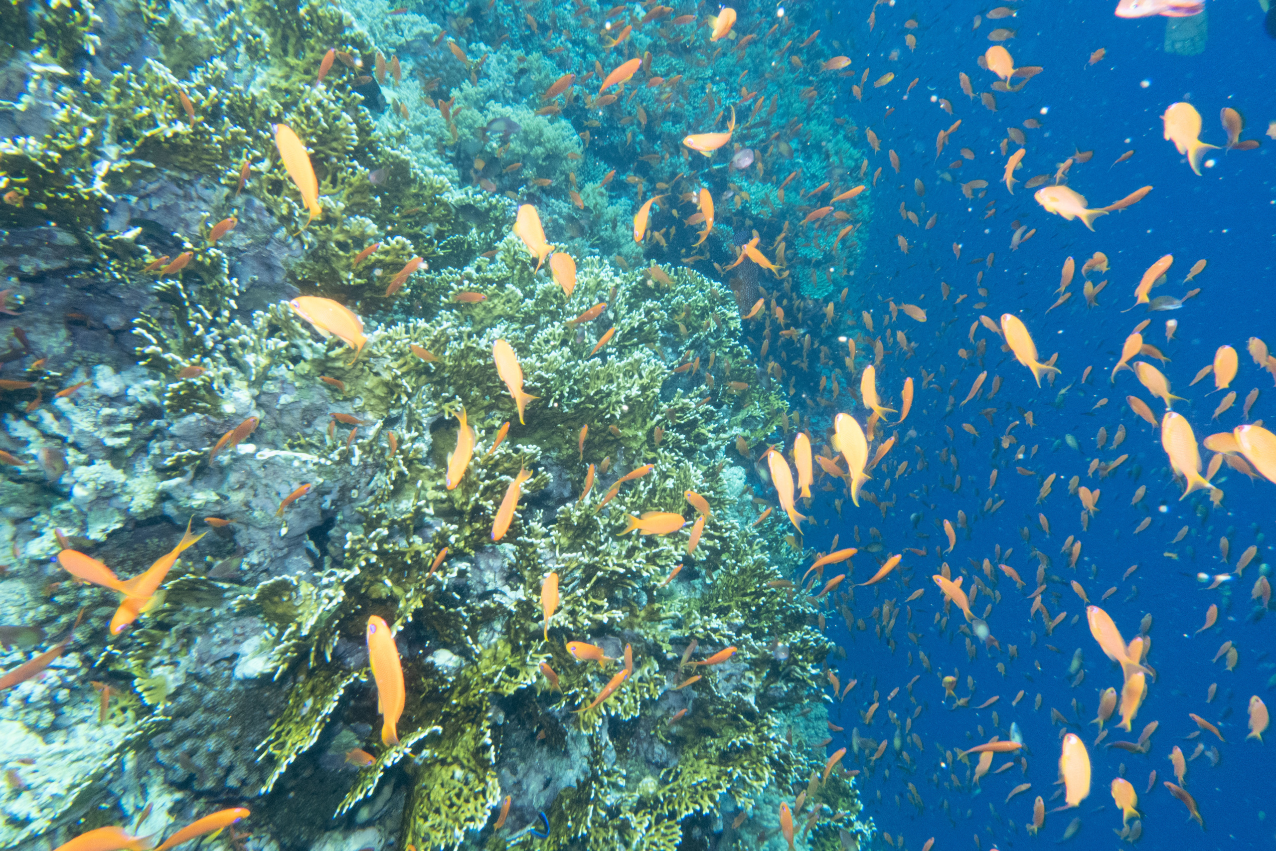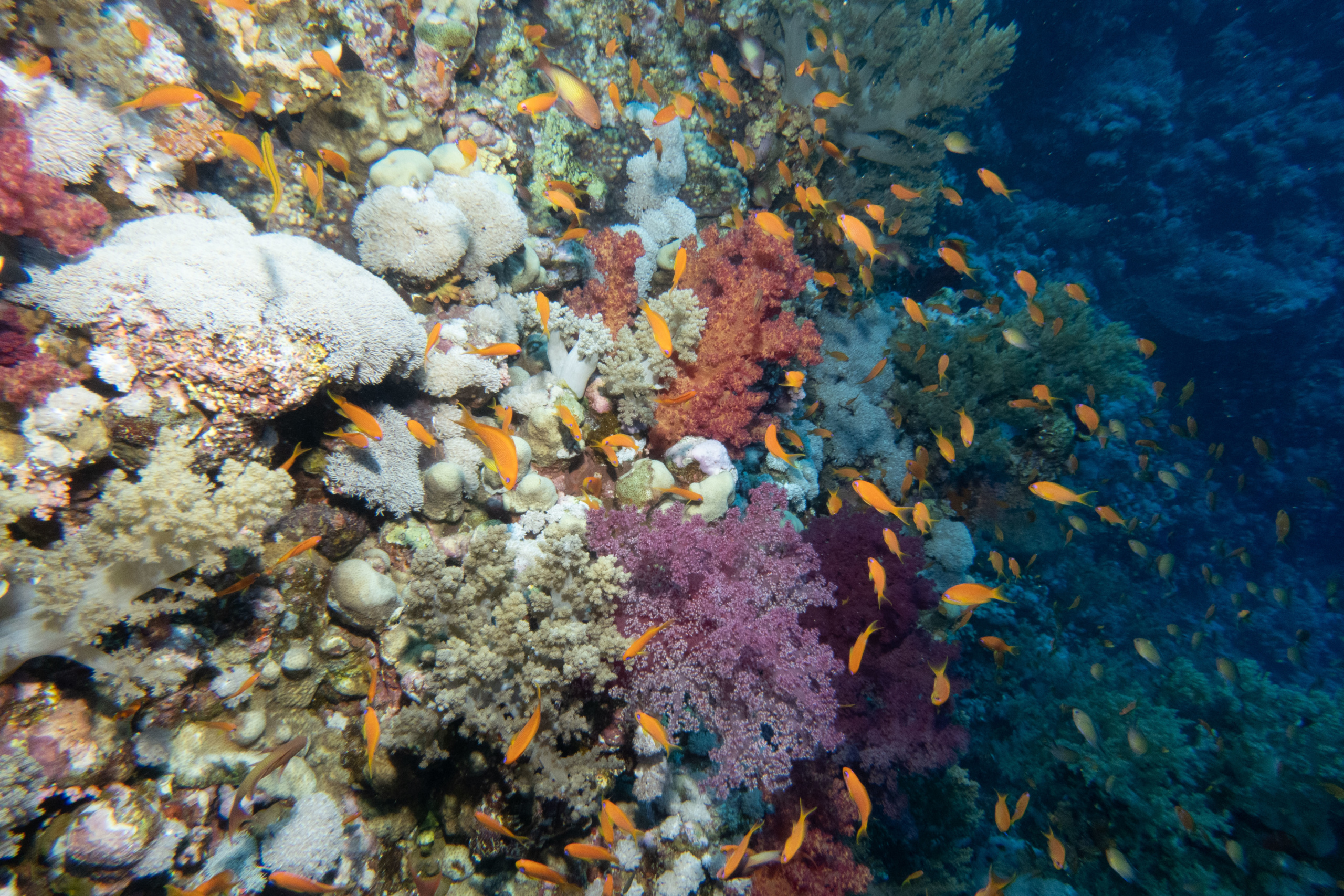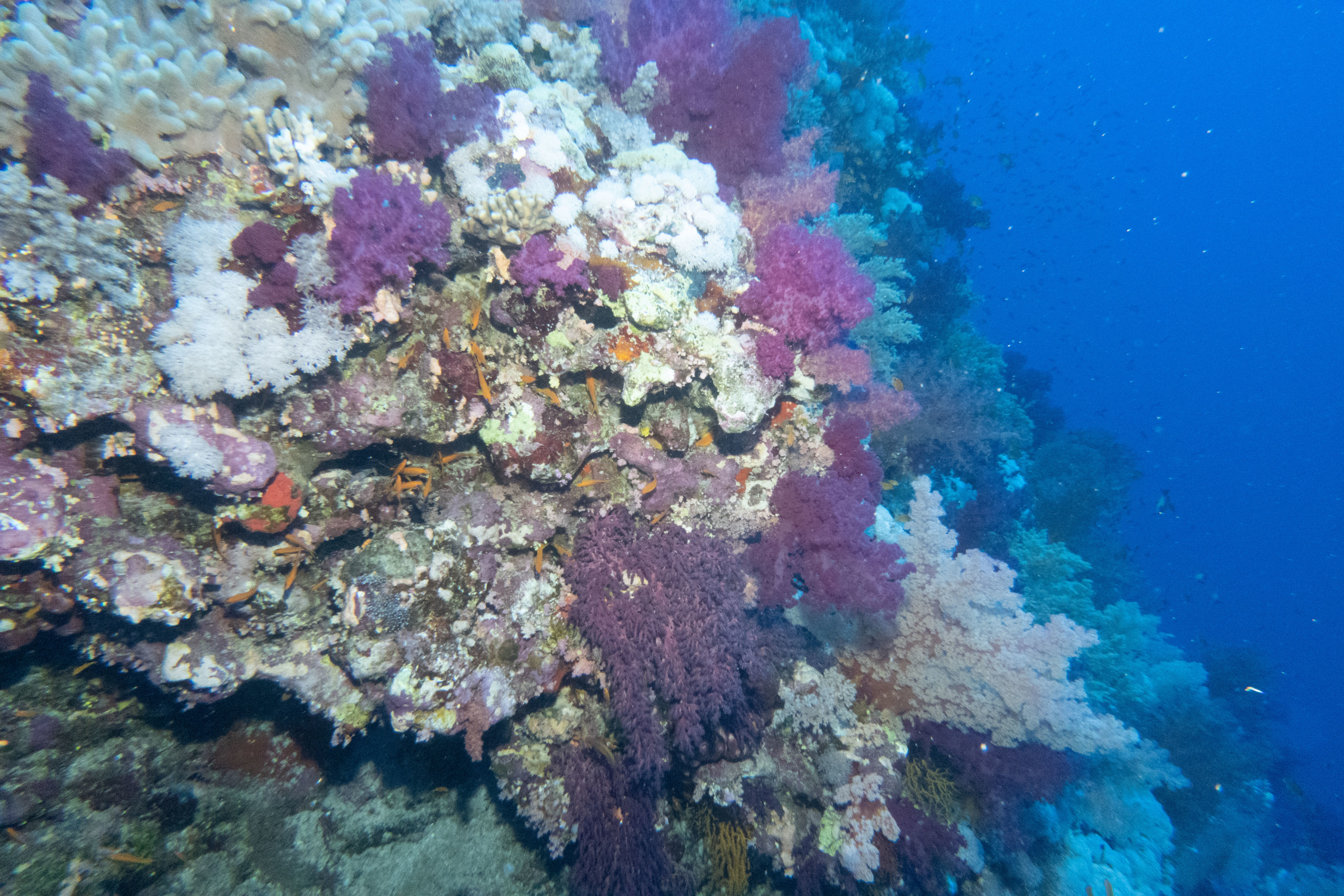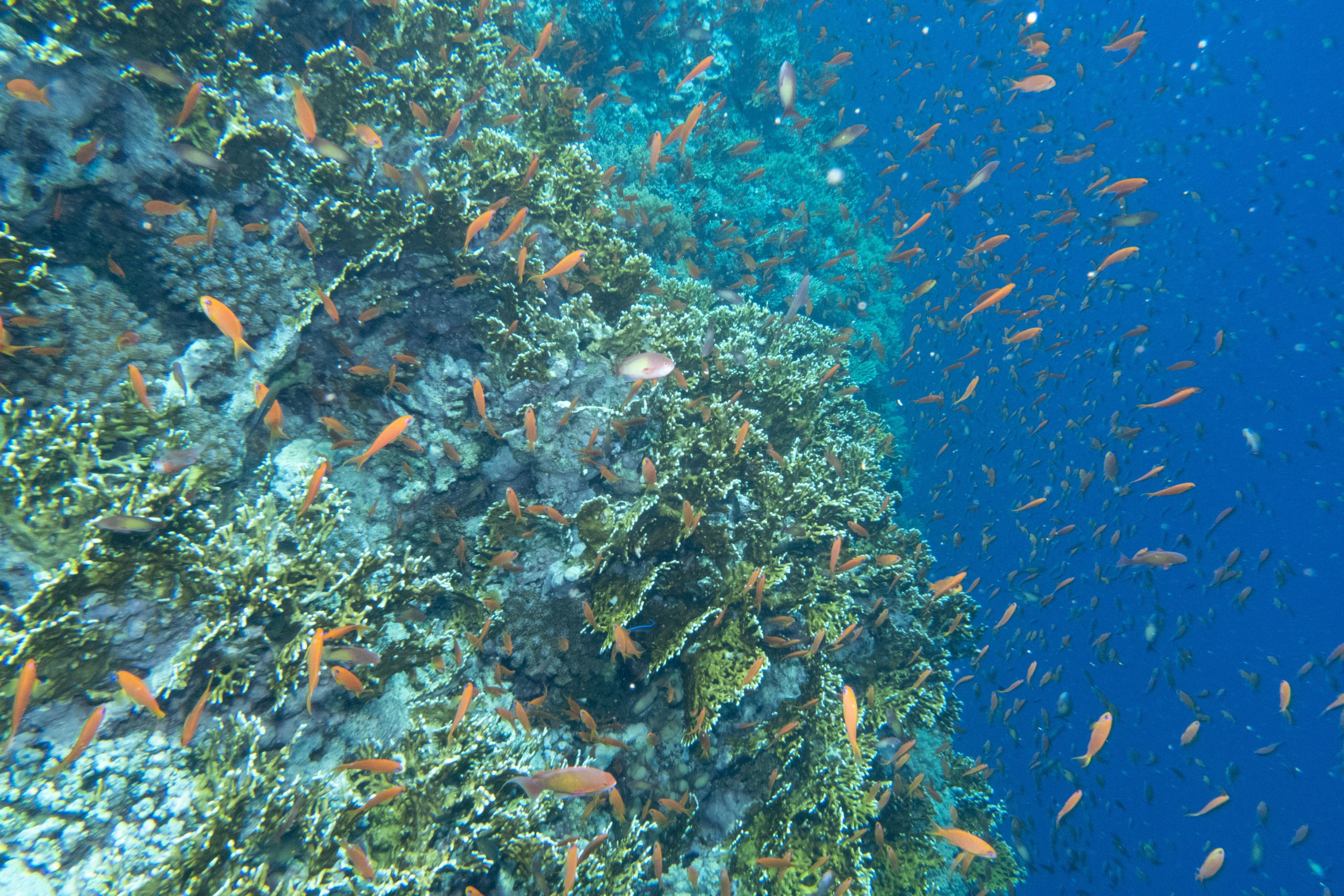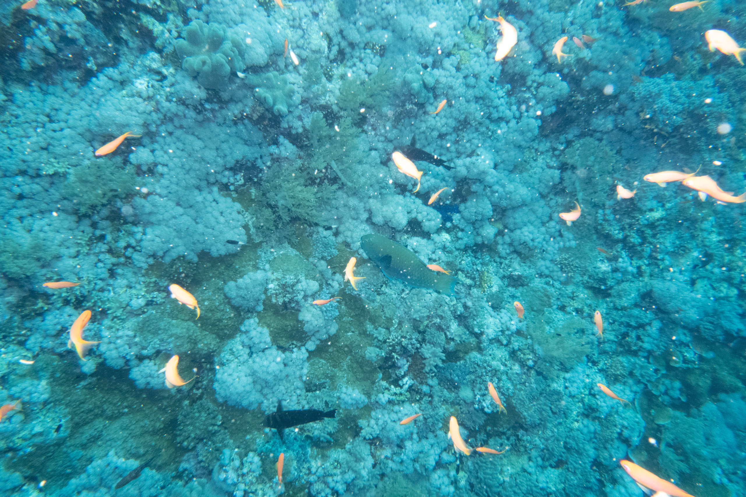 Das Mittagessen ist sehr gut, nachher überqueren wir den kurzen 5min Seeweg zum Little Brother, wo unser letzter Brothers-Tauchgang stattfinden wird. (Man darf auf den Brothers seit 2018 (?) nicht mehr übernachten, da Biologen in monatelanger Arbeit herausgefunden haben dass die Schiffe die Haie aggressiv machen.) Wir betauchen den Nordwesten, wo wir eine Putzstation besuchen, wo wir einen kurzen Blick auf einen Grauen Riffhai ergattern können. Es herrscht jedoch starke Strömung, also steigen wir ein bisschen auf und genießen die vbF am Riff. Nach dem Abendessen geht es auf nach Daedalus.