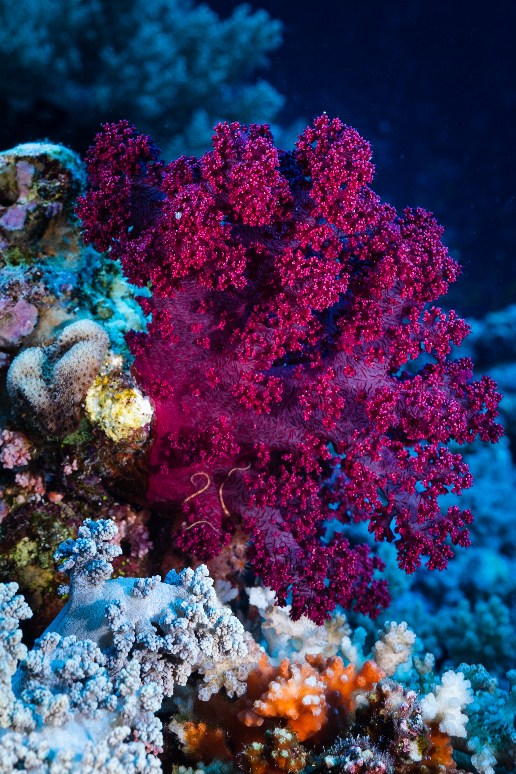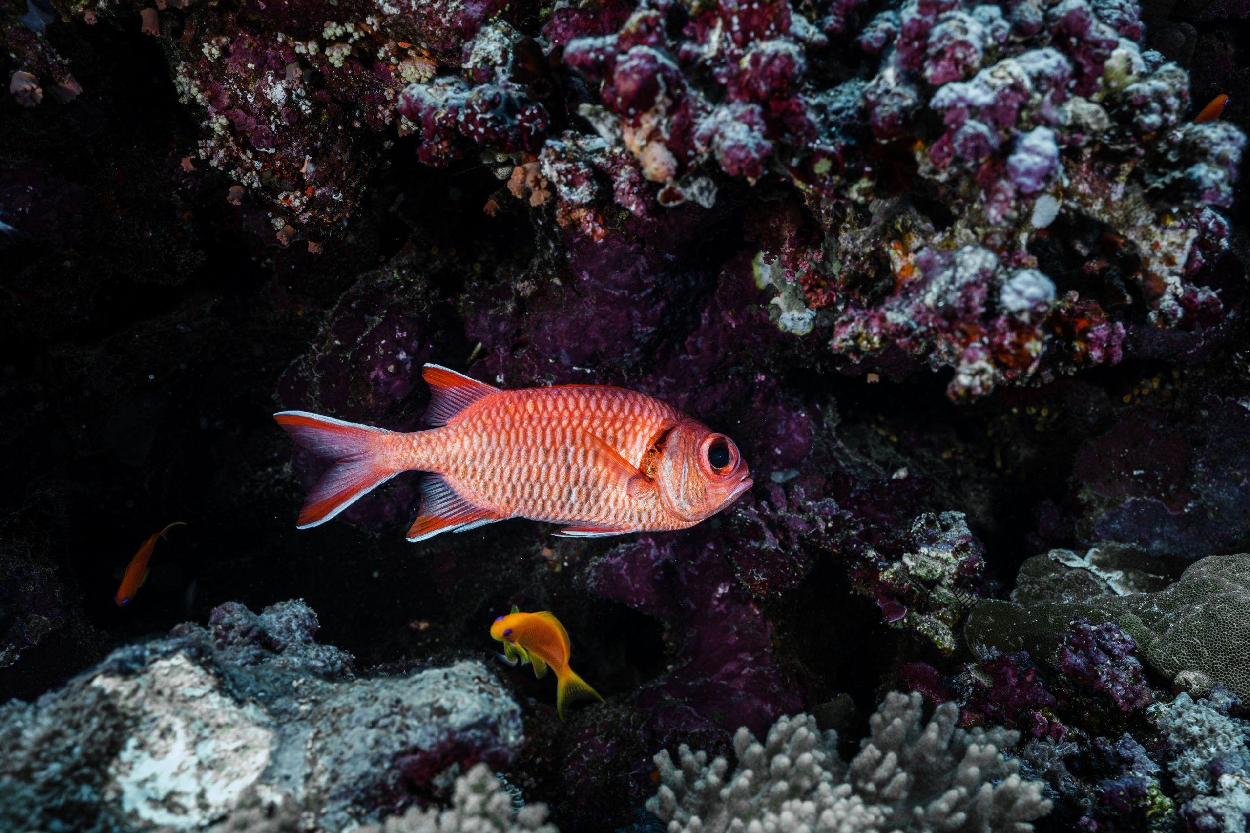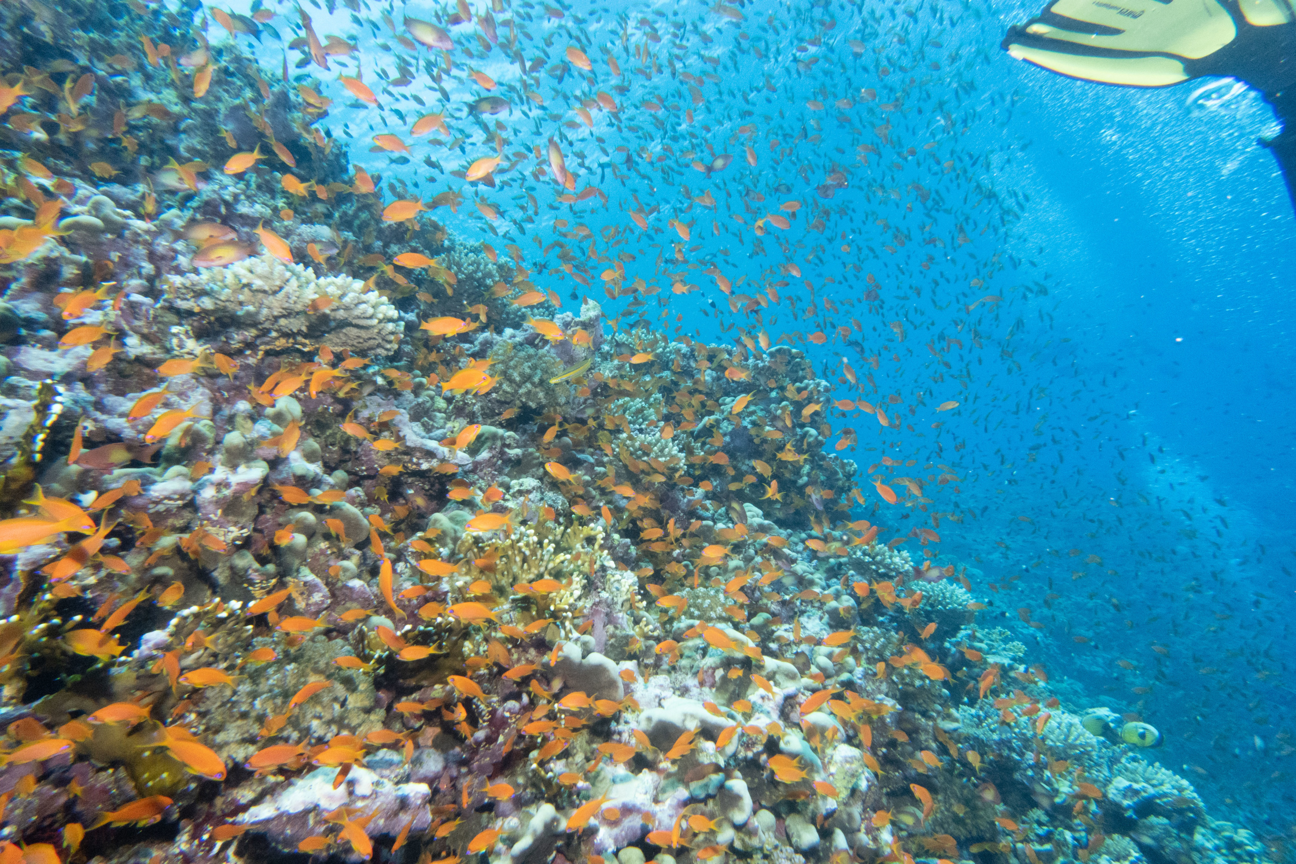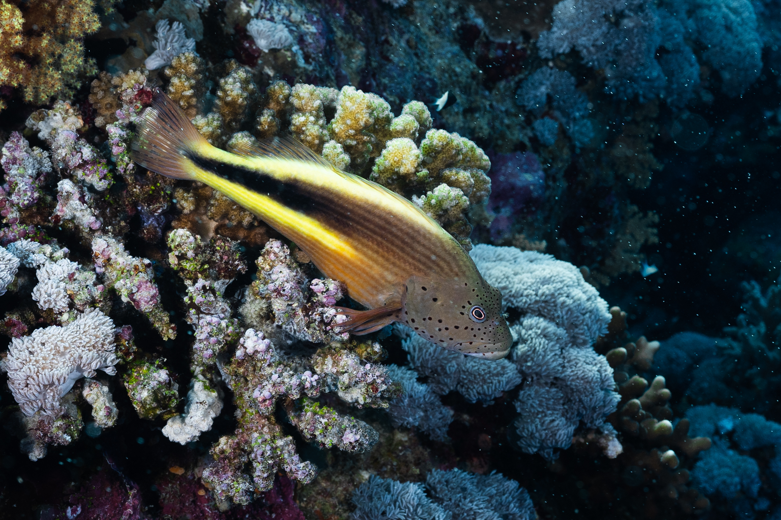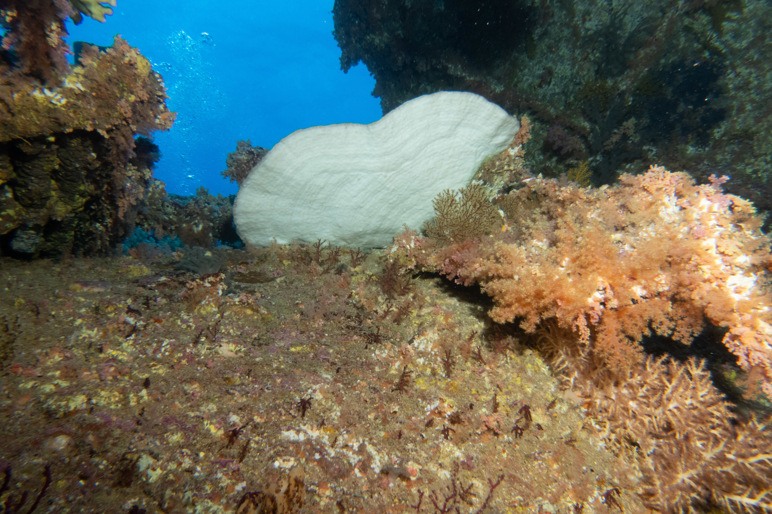 Das Mittagessen ist sehr gut, nachher überqueren wir den kurzen 5min Seeweg zum Little Brother, wo unser letzter Brothers-Tauchgang stattfinden wird. (Man darf auf den Brothers seit 2018 (?) nicht mehr übernachten, da Biologen in monatelanger Arbeit herausgefunden haben dass die Schiffe die Haie aggressiv machen.) Wir betauchen den Nordwesten, wo wir eine Putzstation besuchen, wo wir einen kurzen Blick auf einen Grauen Riffhai ergattern können. Es herrscht jedoch starke Strömung, also steigen wir ein bisschen auf und genießen die vbF am Riff. Nach dem Abendessen geht es auf nach Daedalus.