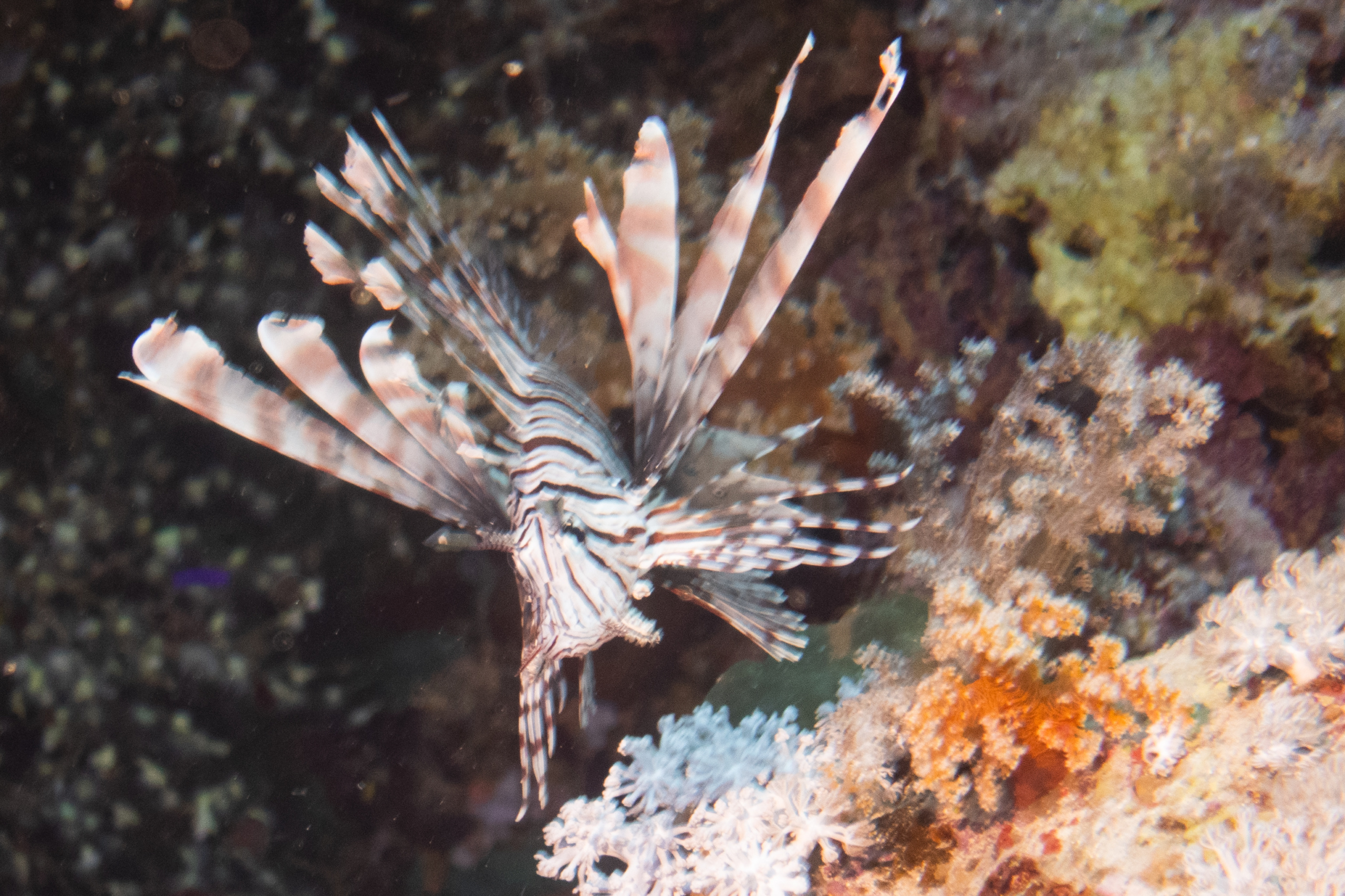 Der dritte Tauchgang ist sehr entspannt am Südplateau, wo wir uns vom Zodiac abwerfen und zurückdriften lassen. Wir sehen neugierige Napoleonfische, Flötenfische, Feuerfische und vieles mehr.