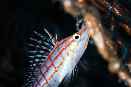Als wir heute – um 6:30 – aufstehen, geht es mir schon viel besser und ich beschließe, zumindest den ersten Tauchgang zu versuchen. Wir sind bei Small Giftun (scheinbar ein bekannter Platz) bei Hurghada und betauchen die Police Station. Hier gibt es viele Gorgonien, in denen sich der unter Deutschsprachigen sehr beliebte Langnasen-Büschelbarsch (Lanabüba) versteckt. Und tatsächlich – auf ca. 26m finde ich einen! Zuerst versteckt er sich so unter der Gorgonie, dass ein Foto nicht möglich ist, doch nach kurzer Zeit kommt er kurz hoch und ich kann ein paar mal schnell abdrücken. Ich bin sehr glücklich und der Rest des Tauchgangs läuft entspannt mit einigen Muränen und auch einem Krokodilfisch.