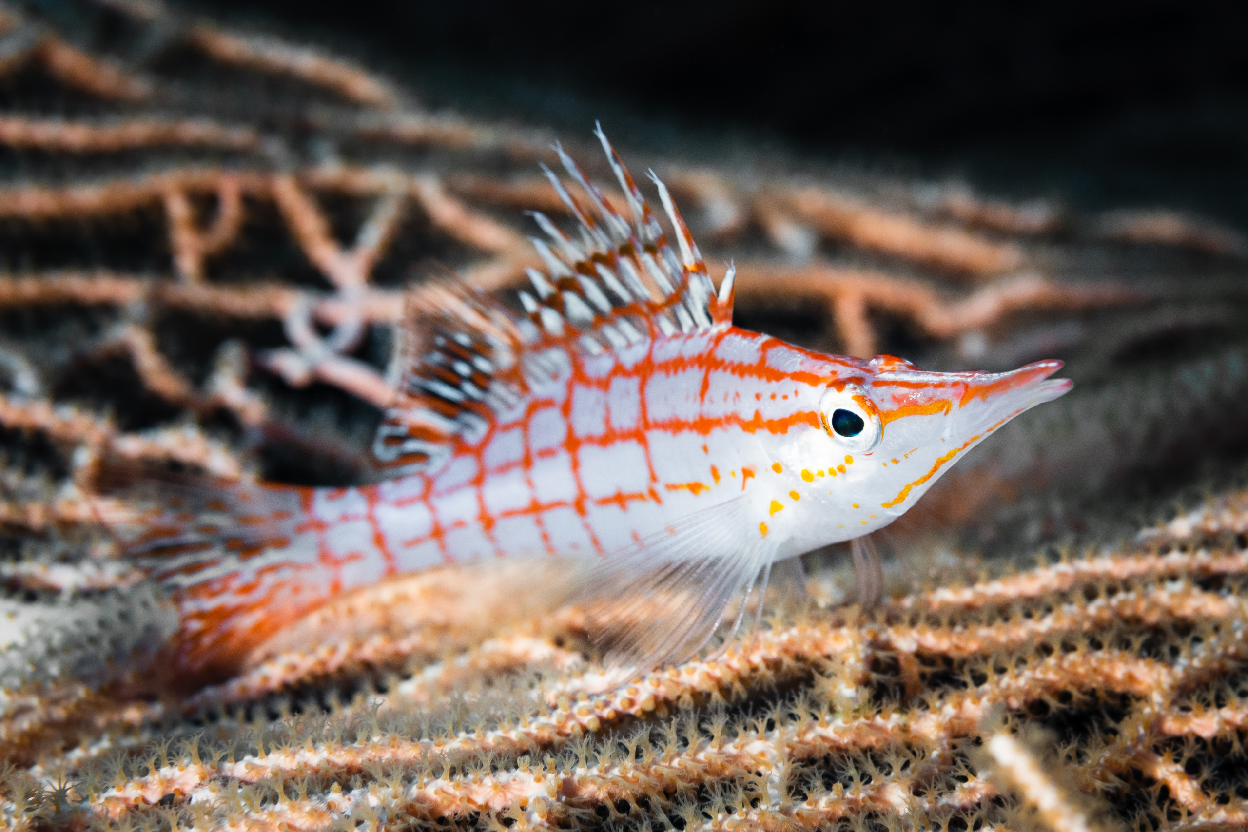 Als wir heute – um 6:30 – aufstehen, geht es mir schon viel besser und ich beschließe, zumindest den ersten Tauchgang zu versuchen. Wir sind bei Small Giftun (scheinbar ein bekannter Platz) bei Hurghada und betauchen die Police Station. Hier gibt es viele Gorgonien, in denen sich der unter Deutschsprachigen sehr beliebte Langnasen-Büschelbarsch (Lanabüba) versteckt. Und tatsächlich – auf ca. 26m finde ich einen! Zuerst versteckt er sich so unter der Gorgonie, dass ein Foto nicht möglich ist, doch nach kurzer Zeit kommt er kurz hoch und ich kann ein paar mal schnell abdrücken. Ich bin sehr glücklich und der Rest des Tauchgangs läuft entspannt mit einigen Muränen und auch einem Krokodilfisch.