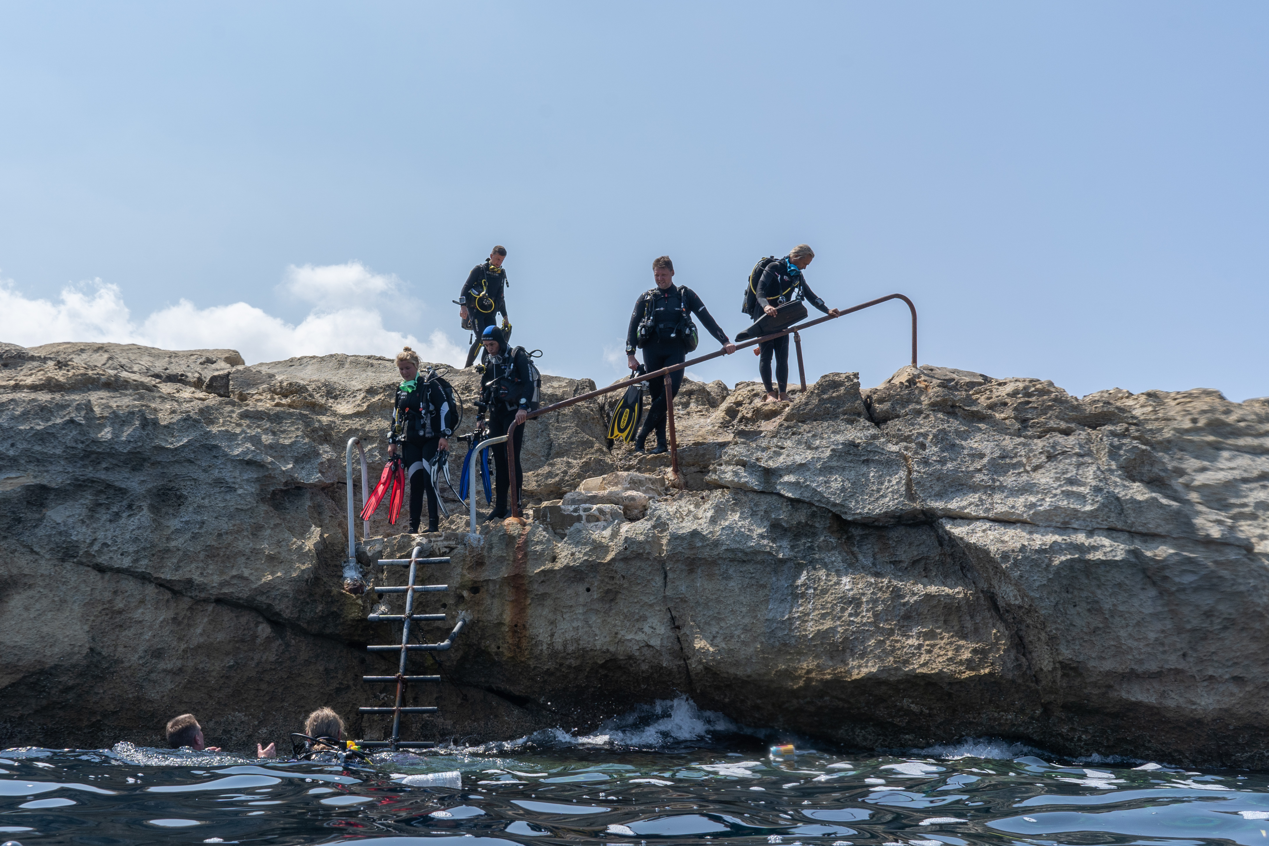 Heute konnte ich ENDLICH wieder tauchen. Und das gleich auf einem super Tauchplatz – Cathedral Cave. Dieser ist sicherlich einer der schönsten auf der Insel, man taucht in die namensgebende Höhle, in der man auch auftauchen und dank einem Spalt Frischluft atmen kann. Herausragend ist sie aber vor allem aufgrund des Lichts das von außen hereinkommt und den Höhleneingang (und etwaige Taucher) als schöne Silhouette erstrahlen lässt. Der zweite Tauchgang war bei Reqqa Point, nur wenige hundert Meter entfernt. Hier hatte ich allerdings leichte Druckausgleichs- und Maskenschwierigkeiten, was das Tauchen etwas stressig gemacht hat. Ich konnte allerdings einige Quallen und sogar einen Oktopus fotografieren.