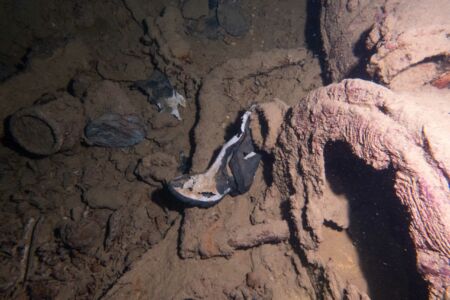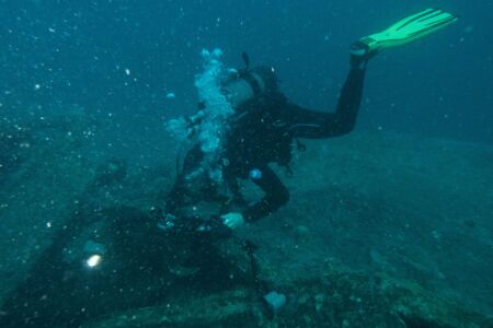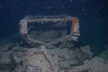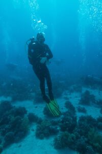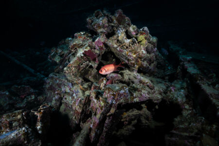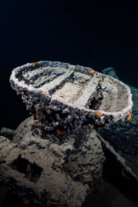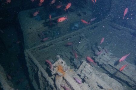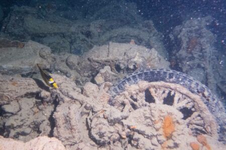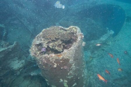 Nach dem Mittagessen machen wir fast denselben Tauchgang nochmal, wir schwimmen durchs untere Deck zum Bug und steigen dann zum oberen auf. Doch bei der Kommandobrücke verlassen wir es dann durch ein Loch ans Oberdeck und schauen dieses an. Wir sehen auch zwei Schildkröten, die „tanzen“.