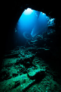 Auf diesem Tauchplatz herrscht eigentlich immer Strömung, weshalb man sich an einer Strömungsleine zum Wrack hinunterzieht. Mir wird nun klar wieso ich noch nie ein Bild der Thistlegorm von außen gesehen hatte – die Sicht ist ziemlich schlecht, überall fliegen Schwebeteilchen herum, das komplette Schiff ist absolut nicht sichtbar. Wir penetrieren es über die Löcher, die die Bomben hinterlassen haben und tauchen am untersten Deck in Richtung Bug. Dieses Deck ist ca. 3m hoch, es ist also genügend Platz. Wir sehen Motorräder, Lastwägen, Reifen, Schuhe, … Entgegen des Tauchplans gehen wir am Bug dann ins obere Deck hoch, scheinbar hatte Ellia genügend Vertrauen in unsere Tarierfähigkeiten, denn dieses Deck ist nur etwa 1.5m hoch, man muss also wesentlich besser auf die Tarierung Acht geben. Hier merke ich auch, dass ich noch nicht ganz so ein gutes Gefühl dafür habe wie groß die Flasche über meinem Kopf ist, ich bumpe ein paarmal mit der Flasche gegen die Decke. Gegen Ende werde ich ein bisschen nervös, ich hatte (wahrscheinlich durch die Aufregung) einen etwas höheren Luftverbrauch und habe durch die vielen Windungen und Türen schon vor einiger Zeit das Gefühl dafür verloren, wo wir uns im Wrack befinden. Doch kurz darauf erreichen wir das Ende und ich kann mit genügend Luftreserven aufsteigen. (Und selbst wenn nicht, Ingrid und Ines brauchen sowieso keine Luft, wir hatten also immer genügend Reserven mit 😛 )