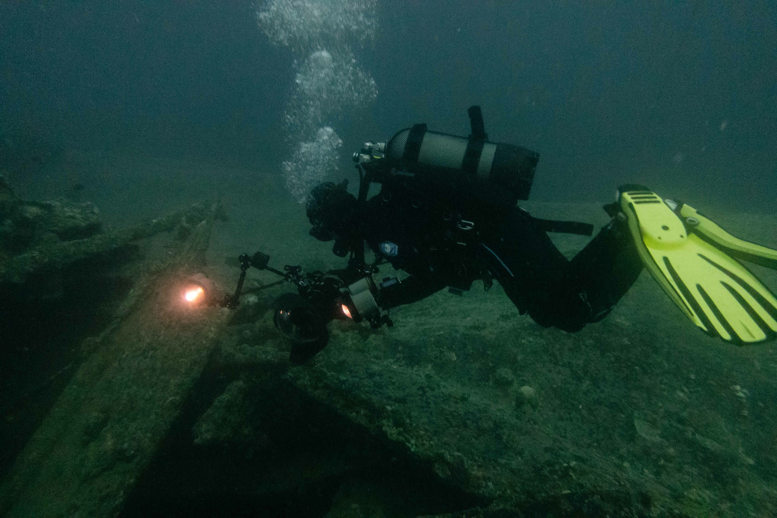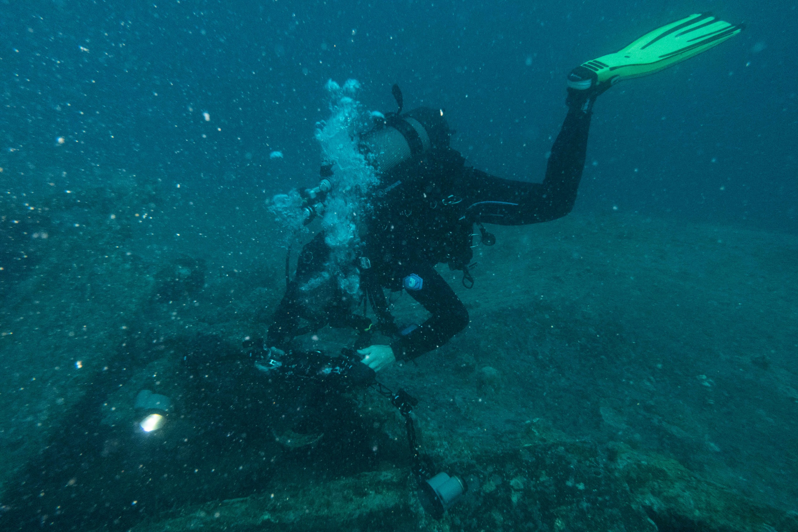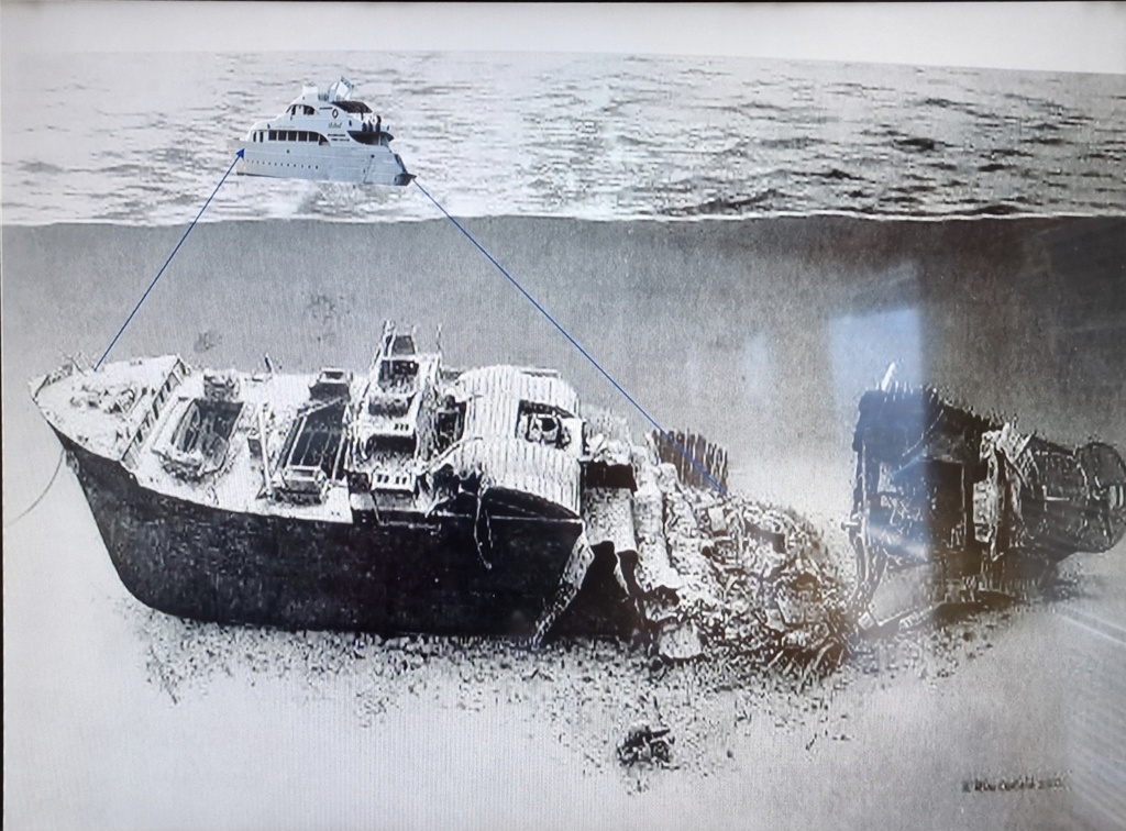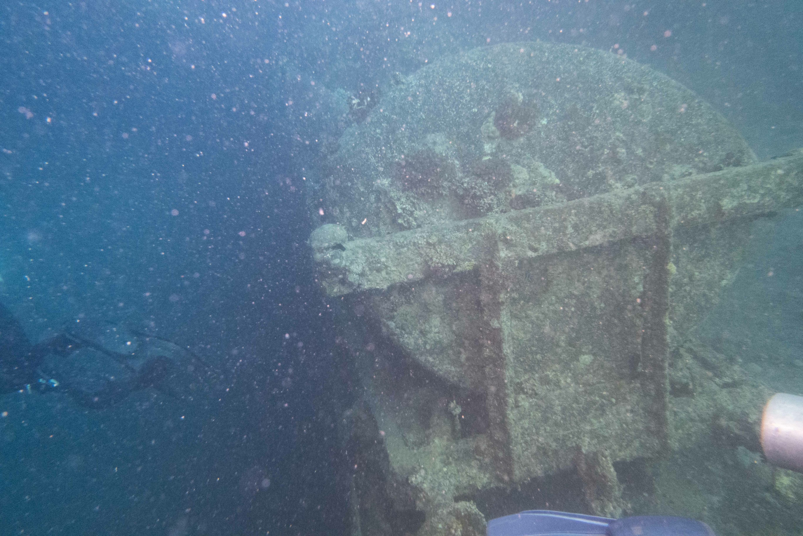 Nach dem Mittagessen machen wir fast denselben Tauchgang nochmal, wir schwimmen durchs untere Deck zum Bug und steigen dann zum oberen auf. Doch bei der Kommandobrücke verlassen wir es dann durch ein Loch ans Oberdeck und schauen dieses an. Wir sehen auch zwei Schildkröten, die „tanzen“.