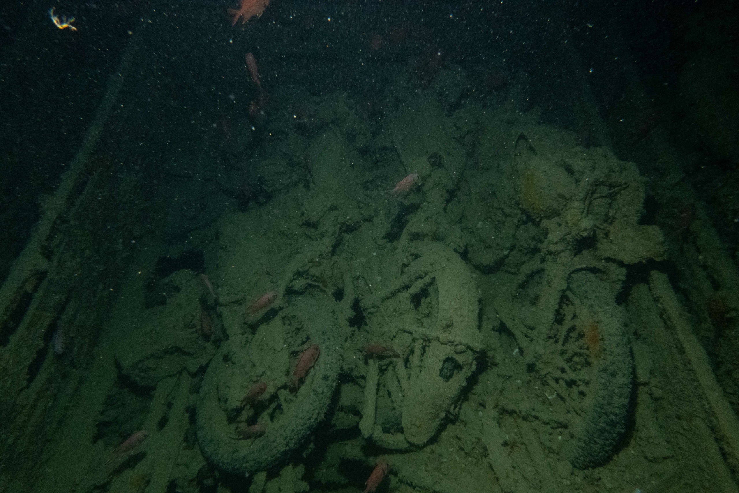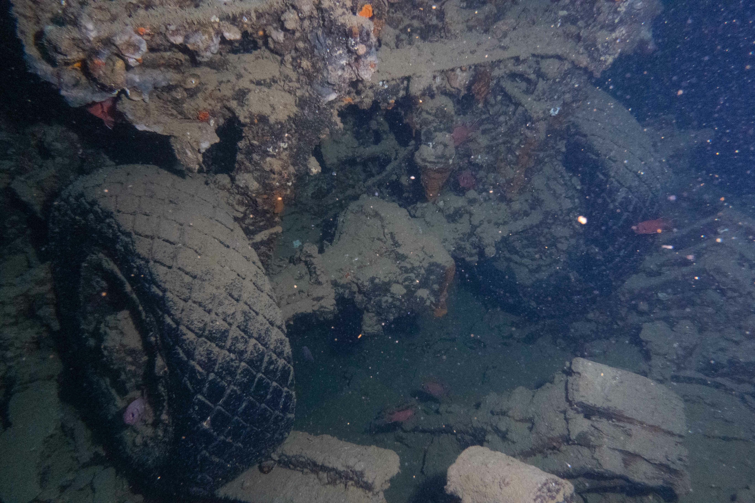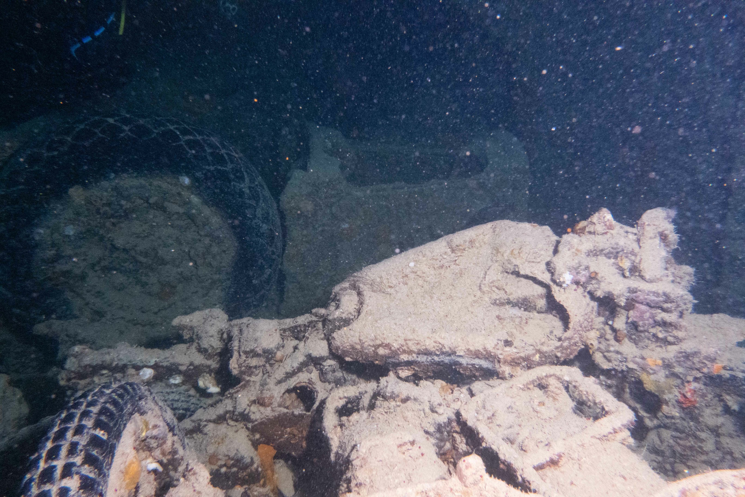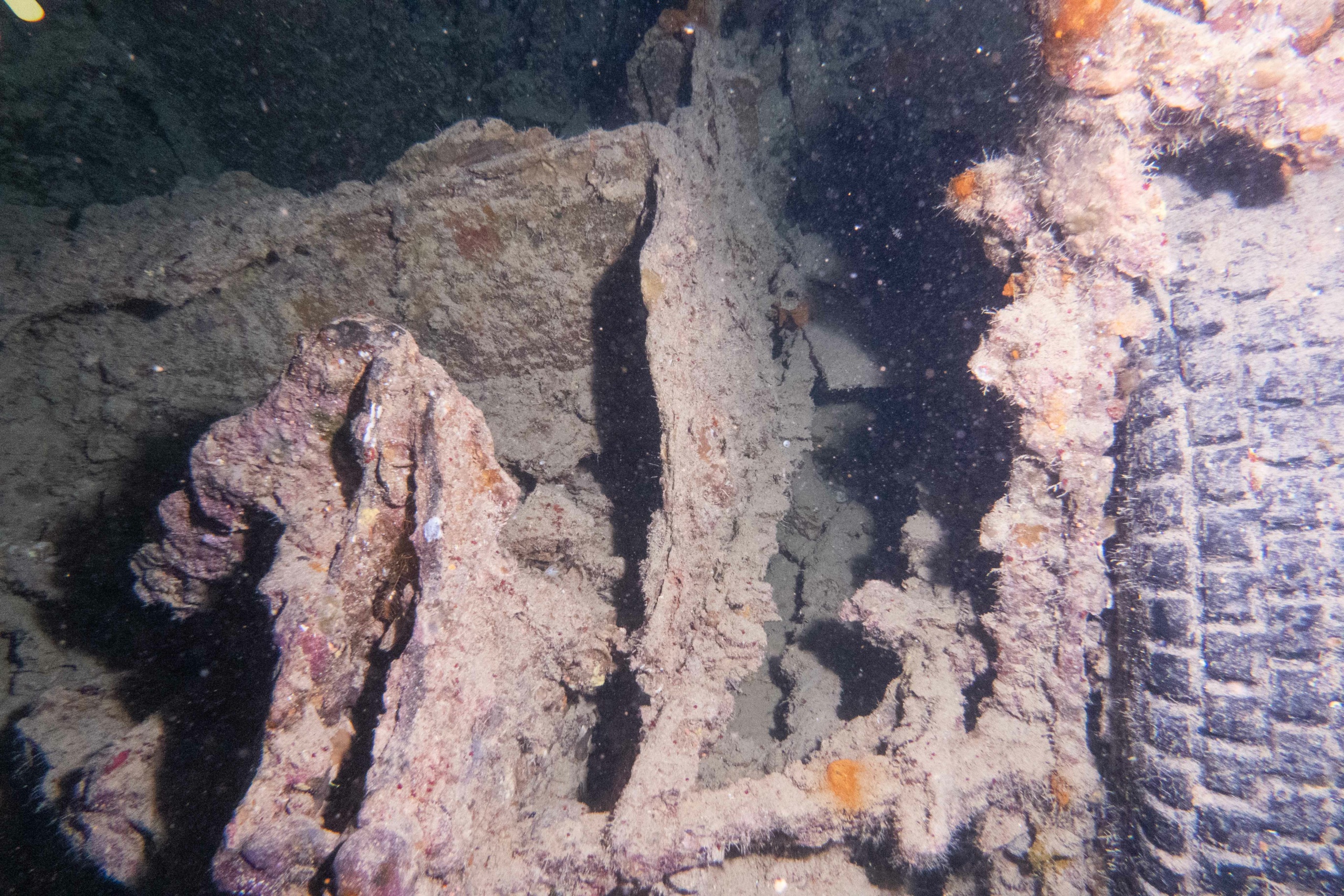 Auf diesem Tauchplatz herrscht eigentlich immer Strömung, weshalb man sich an einer Strömungsleine zum Wrack hinunterzieht. Mir wird nun klar wieso ich noch nie ein Bild der Thistlegorm von außen gesehen hatte – die Sicht ist ziemlich schlecht, überall fliegen Schwebeteilchen herum, das komplette Schiff ist absolut nicht sichtbar. Wir penetrieren es über die Löcher, die die Bomben hinterlassen haben und tauchen am untersten Deck in Richtung Bug. Dieses Deck ist ca. 3m hoch, es ist also genügend Platz. Wir sehen Motorräder, Lastwägen, Reifen, Schuhe, … Entgegen des Tauchplans gehen wir am Bug dann ins obere Deck hoch, scheinbar hatte Ellia genügend Vertrauen in unsere Tarierfähigkeiten, denn dieses Deck ist nur etwa 1.5m hoch, man muss also wesentlich besser auf die Tarierung Acht geben. Hier merke ich auch, dass ich noch nicht ganz so ein gutes Gefühl dafür habe wie groß die Flasche über meinem Kopf ist, ich bumpe ein paarmal mit der Flasche gegen die Decke. Gegen Ende werde ich ein bisschen nervös, ich hatte (wahrscheinlich durch die Aufregung) einen etwas höheren Luftverbrauch und habe durch die vielen Windungen und Türen schon vor einiger Zeit das Gefühl dafür verloren, wo wir uns im Wrack befinden. Doch kurz darauf erreichen wir das Ende und ich kann mit genügend Luftreserven aufsteigen. (Und selbst wenn nicht, Ingrid und Ines brauchen sowieso keine Luft, wir hatten also immer genügend Reserven mit 😛 )