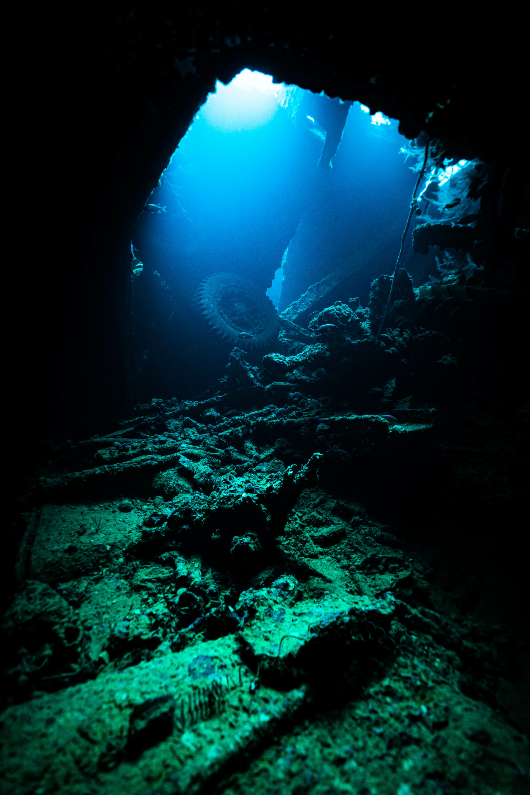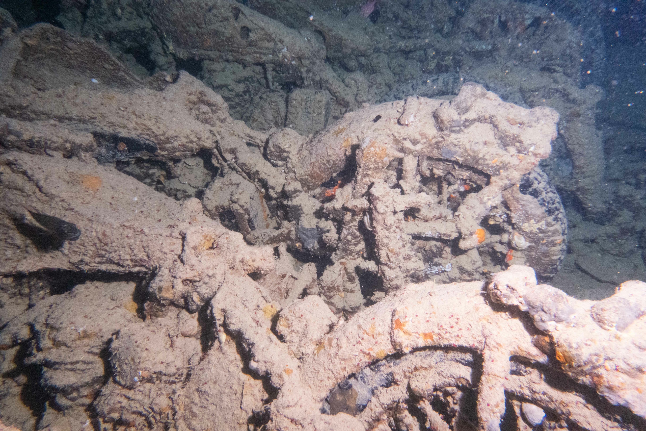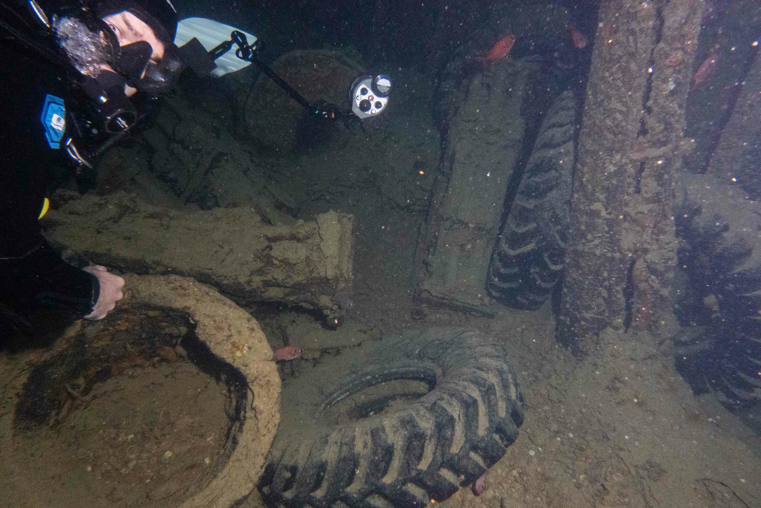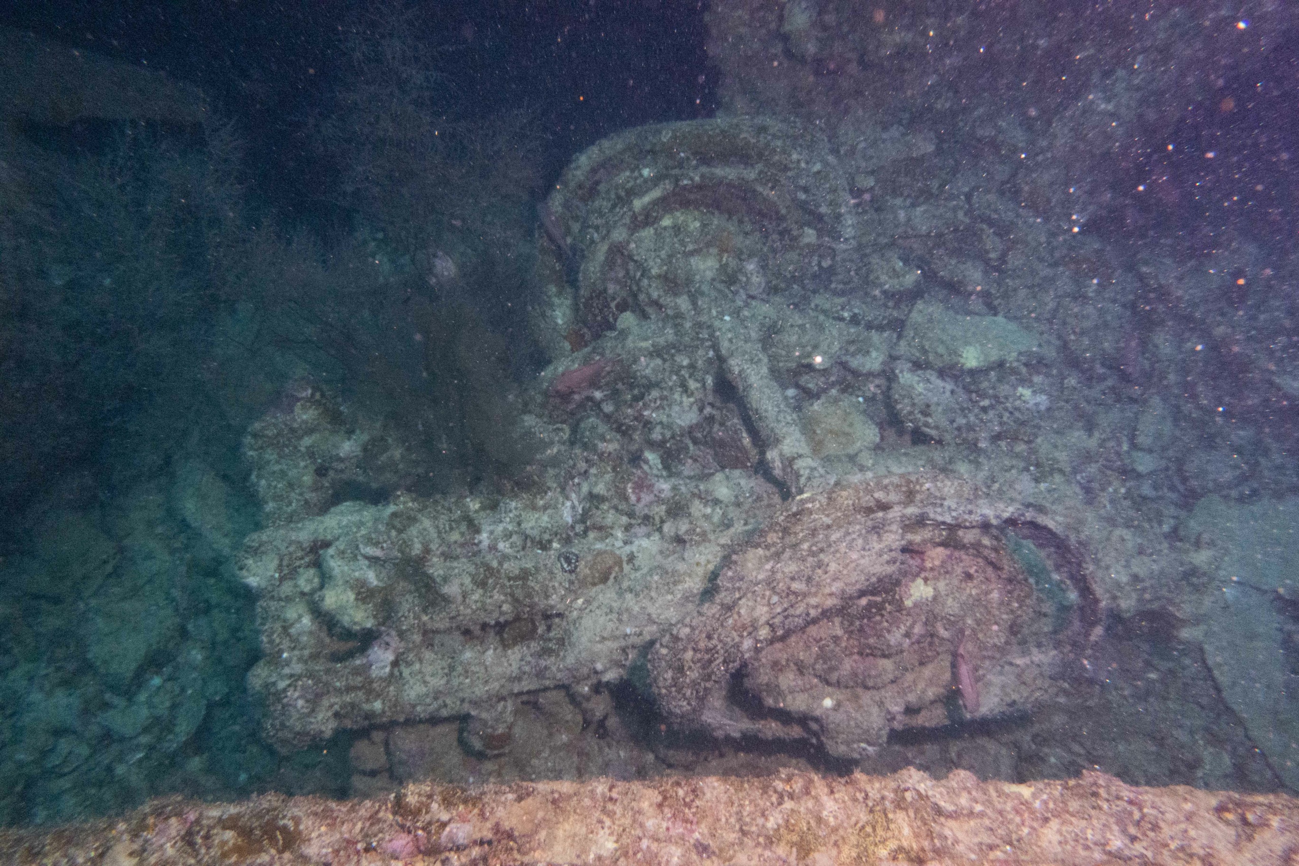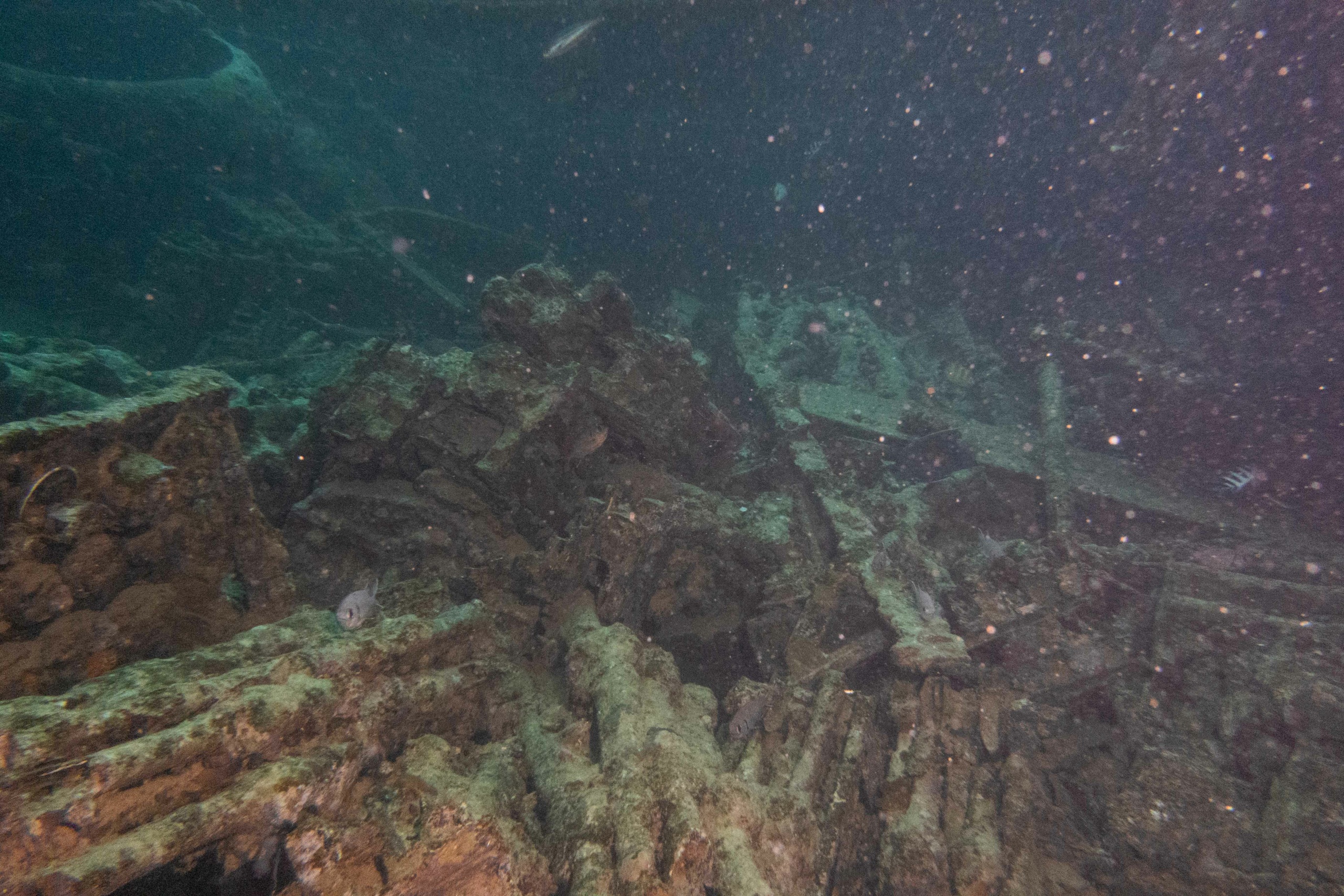 Auf diesem Tauchplatz herrscht eigentlich immer Strömung, weshalb man sich an einer Strömungsleine zum Wrack hinunterzieht. Mir wird nun klar wieso ich noch nie ein Bild der Thistlegorm von außen gesehen hatte – die Sicht ist ziemlich schlecht, überall fliegen Schwebeteilchen herum, das komplette Schiff ist absolut nicht sichtbar. Wir penetrieren es über die Löcher, die die Bomben hinterlassen haben und tauchen am untersten Deck in Richtung Bug. Dieses Deck ist ca. 3m hoch, es ist also genügend Platz. Wir sehen Motorräder, Lastwägen, Reifen, Schuhe, … Entgegen des Tauchplans gehen wir am Bug dann ins obere Deck hoch, scheinbar hatte Ellia genügend Vertrauen in unsere Tarierfähigkeiten, denn dieses Deck ist nur etwa 1.5m hoch, man muss also wesentlich besser auf die Tarierung Acht geben. Hier merke ich auch, dass ich noch nicht ganz so ein gutes Gefühl dafür habe wie groß die Flasche über meinem Kopf ist, ich bumpe ein paarmal mit der Flasche gegen die Decke. Gegen Ende werde ich ein bisschen nervös, ich hatte (wahrscheinlich durch die Aufregung) einen etwas höheren Luftverbrauch und habe durch die vielen Windungen und Türen schon vor einiger Zeit das Gefühl dafür verloren, wo wir uns im Wrack befinden. Doch kurz darauf erreichen wir das Ende und ich kann mit genügend Luftreserven aufsteigen. (Und selbst wenn nicht, Ingrid und Ines brauchen sowieso keine Luft, wir hatten also immer genügend Reserven mit 😛 )