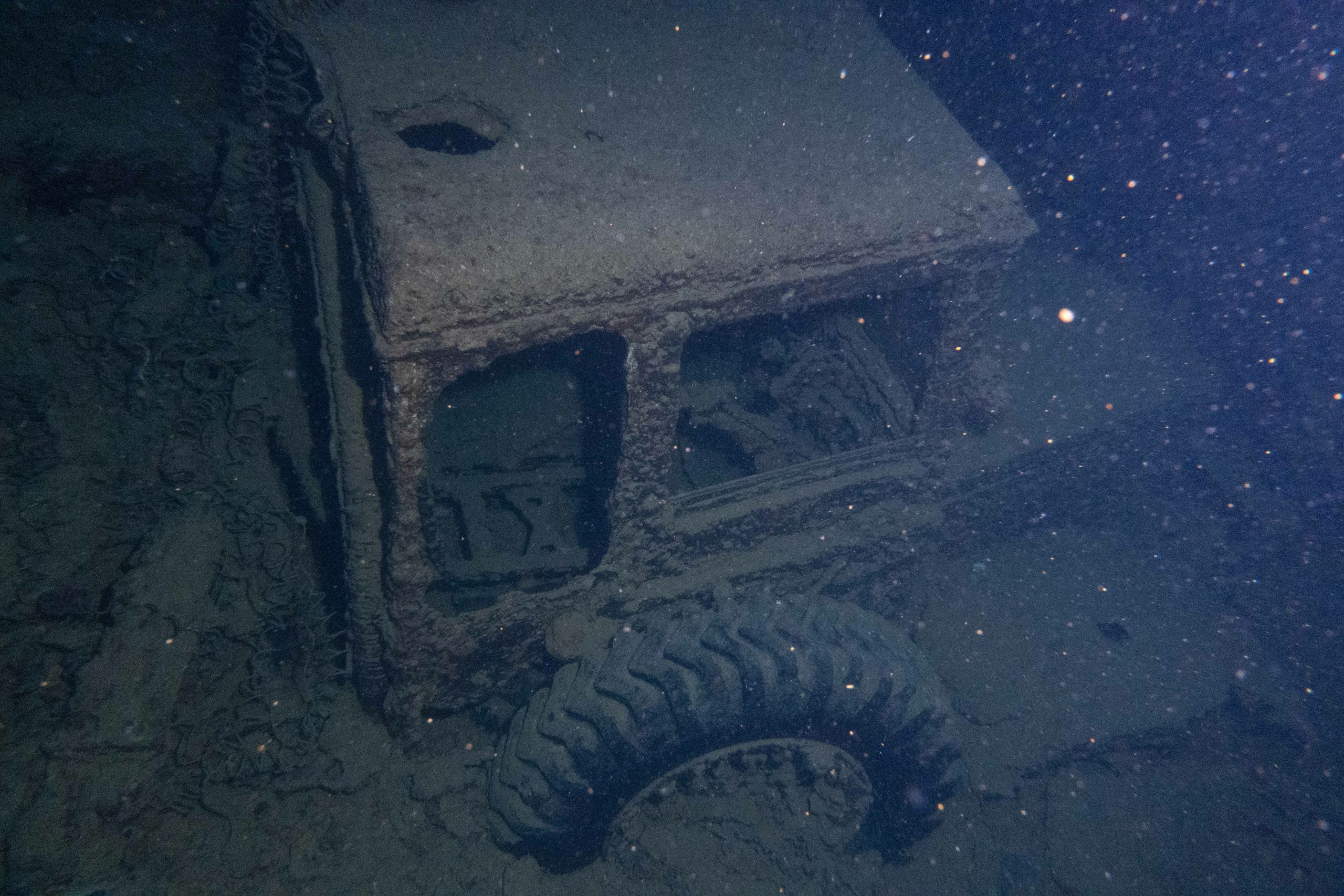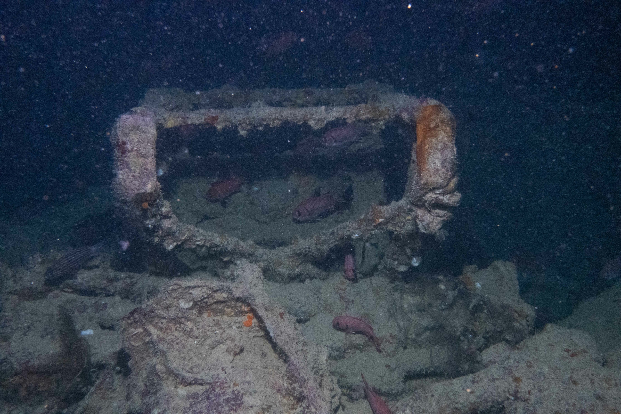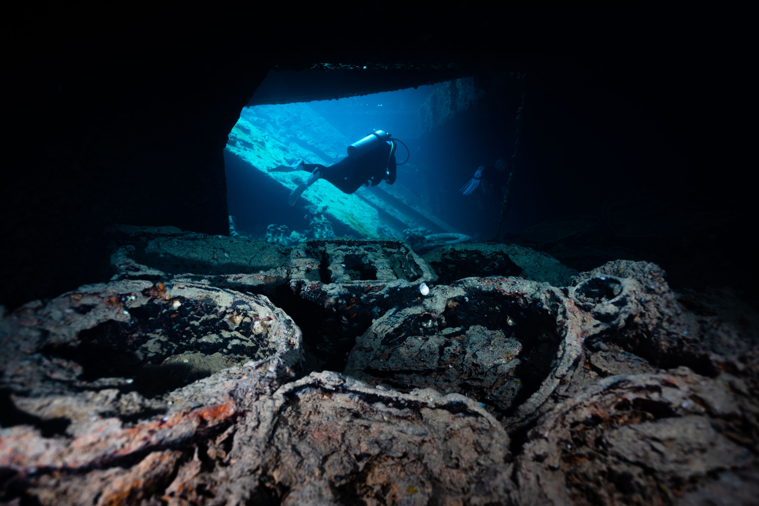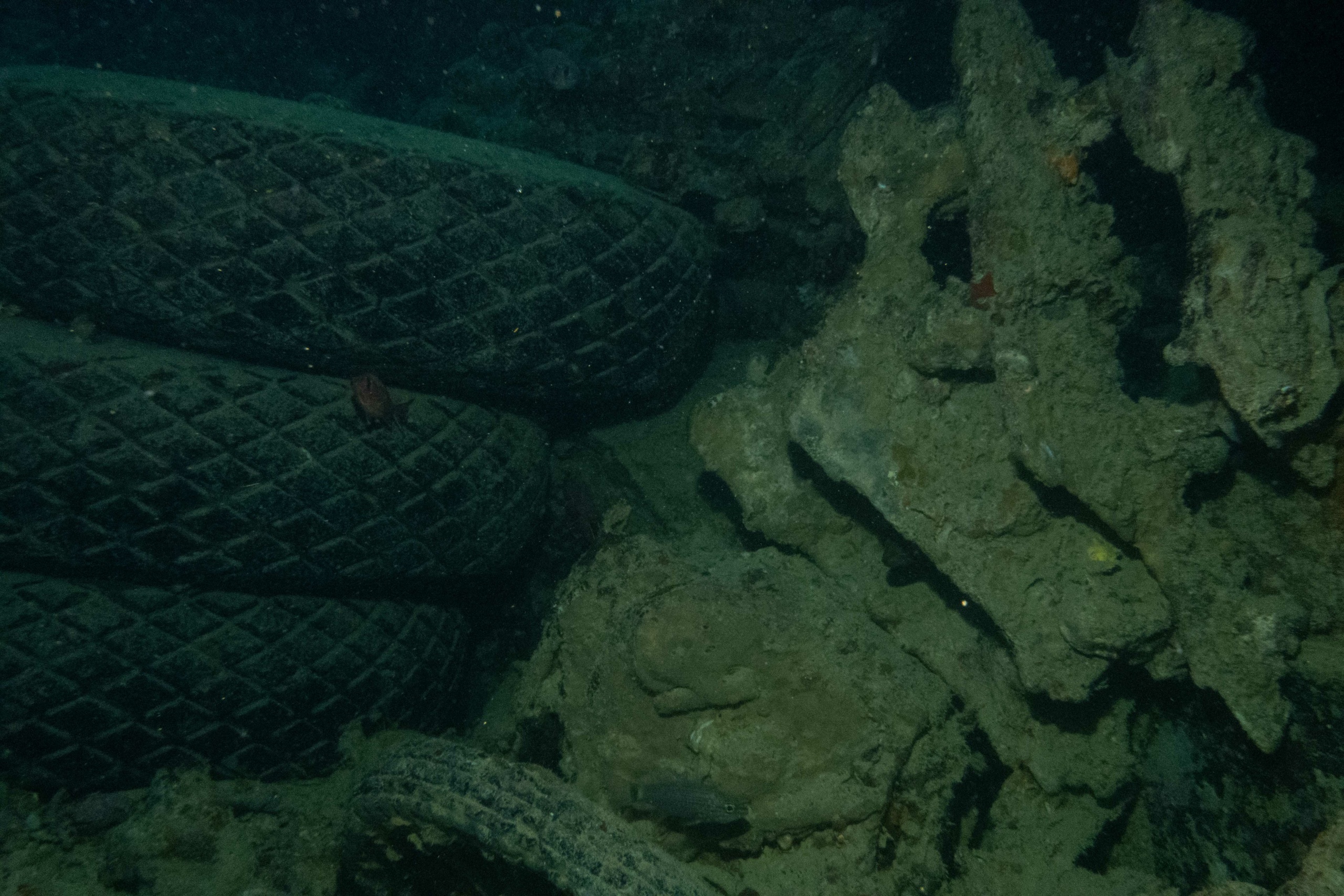 Auf diesem Tauchplatz herrscht eigentlich immer Strömung, weshalb man sich an einer Strömungsleine zum Wrack hinunterzieht. Mir wird nun klar wieso ich noch nie ein Bild der Thistlegorm von außen gesehen hatte – die Sicht ist ziemlich schlecht, überall fliegen Schwebeteilchen herum, das komplette Schiff ist absolut nicht sichtbar. Wir penetrieren es über die Löcher, die die Bomben hinterlassen haben und tauchen am untersten Deck in Richtung Bug. Dieses Deck ist ca. 3m hoch, es ist also genügend Platz. Wir sehen Motorräder, Lastwägen, Reifen, Schuhe, … Entgegen des Tauchplans gehen wir am Bug dann ins obere Deck hoch, scheinbar hatte Ellia genügend Vertrauen in unsere Tarierfähigkeiten, denn dieses Deck ist nur etwa 1.5m hoch, man muss also wesentlich besser auf die Tarierung Acht geben. Hier merke ich auch, dass ich noch nicht ganz so ein gutes Gefühl dafür habe wie groß die Flasche über meinem Kopf ist, ich bumpe ein paarmal mit der Flasche gegen die Decke. Gegen Ende werde ich ein bisschen nervös, ich hatte (wahrscheinlich durch die Aufregung) einen etwas höheren Luftverbrauch und habe durch die vielen Windungen und Türen schon vor einiger Zeit das Gefühl dafür verloren, wo wir uns im Wrack befinden. Doch kurz darauf erreichen wir das Ende und ich kann mit genügend Luftreserven aufsteigen. (Und selbst wenn nicht, Ingrid und Ines brauchen sowieso keine Luft, wir hatten also immer genügend Reserven mit 😛 )