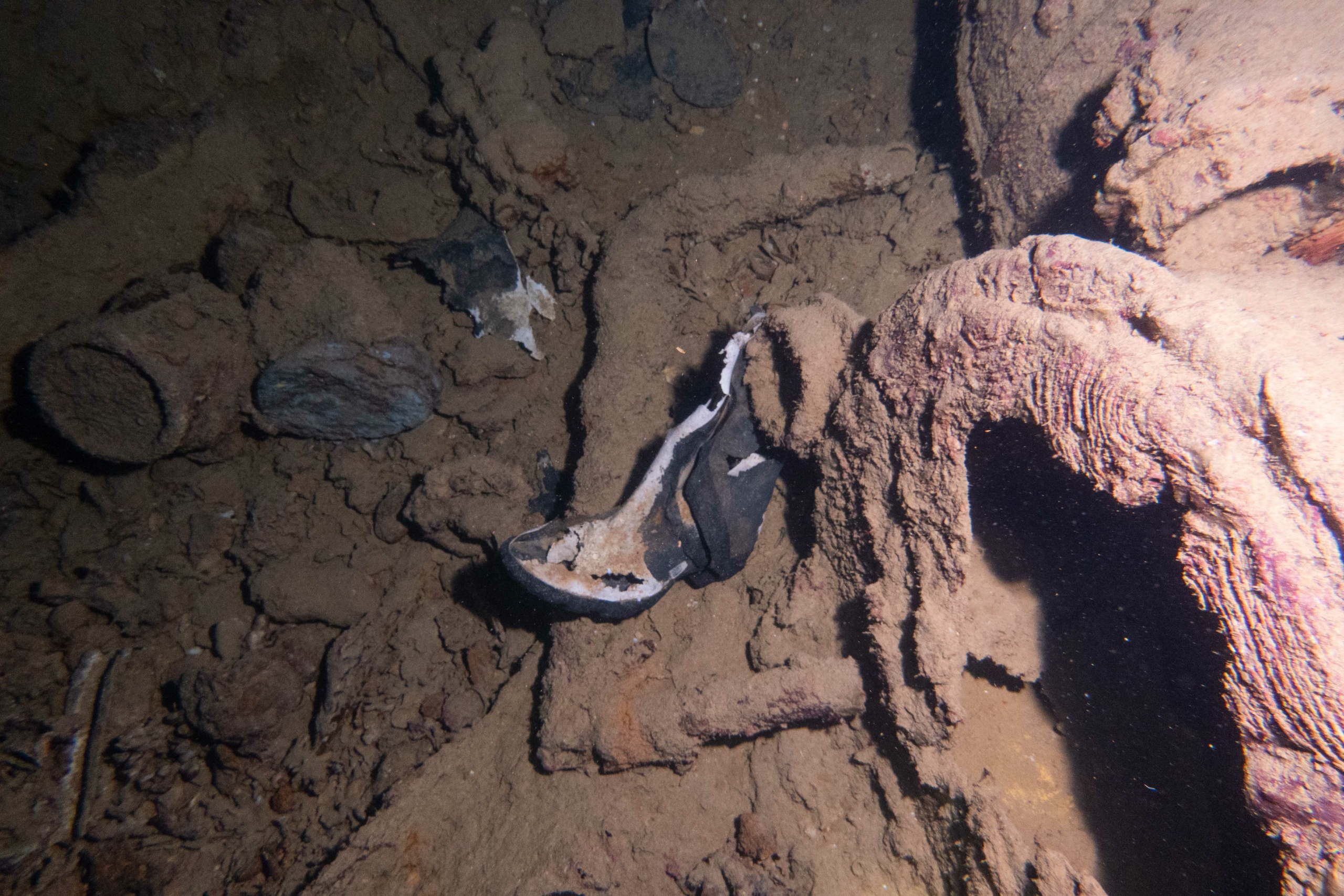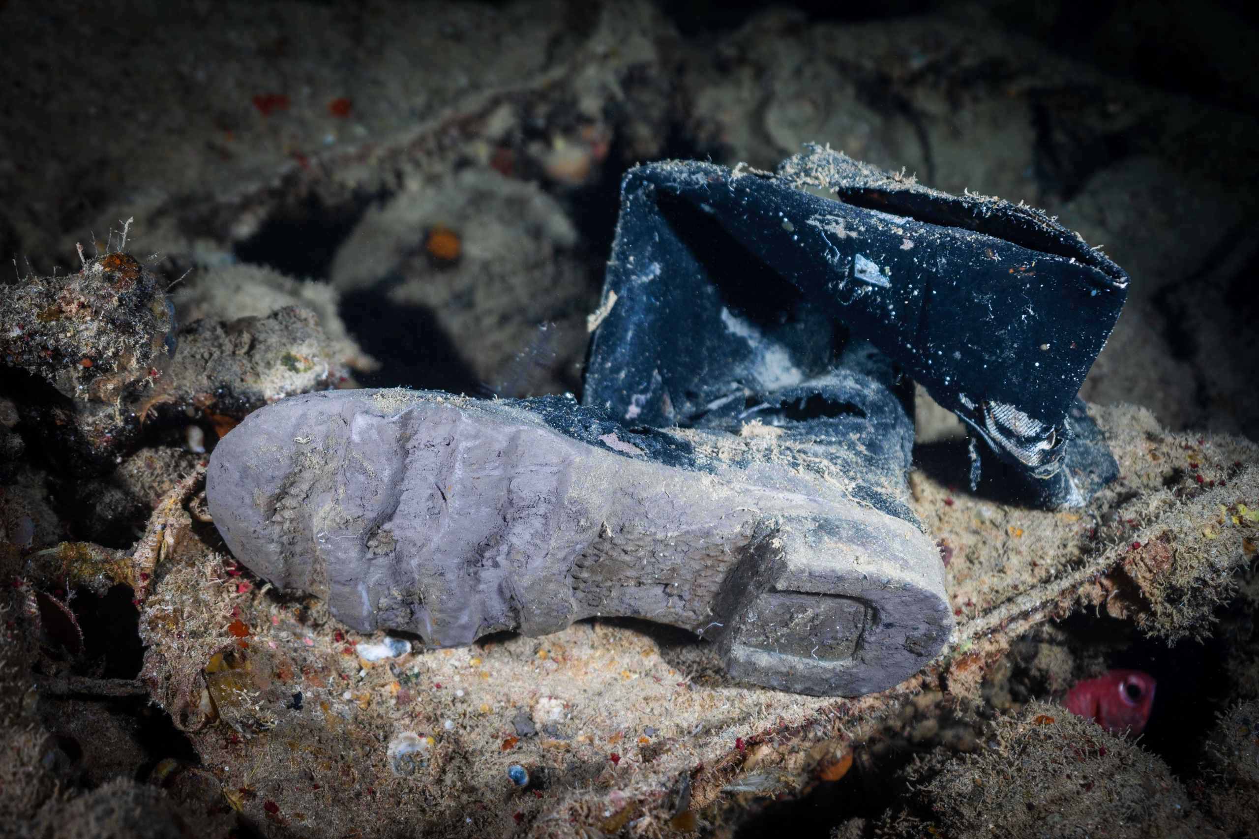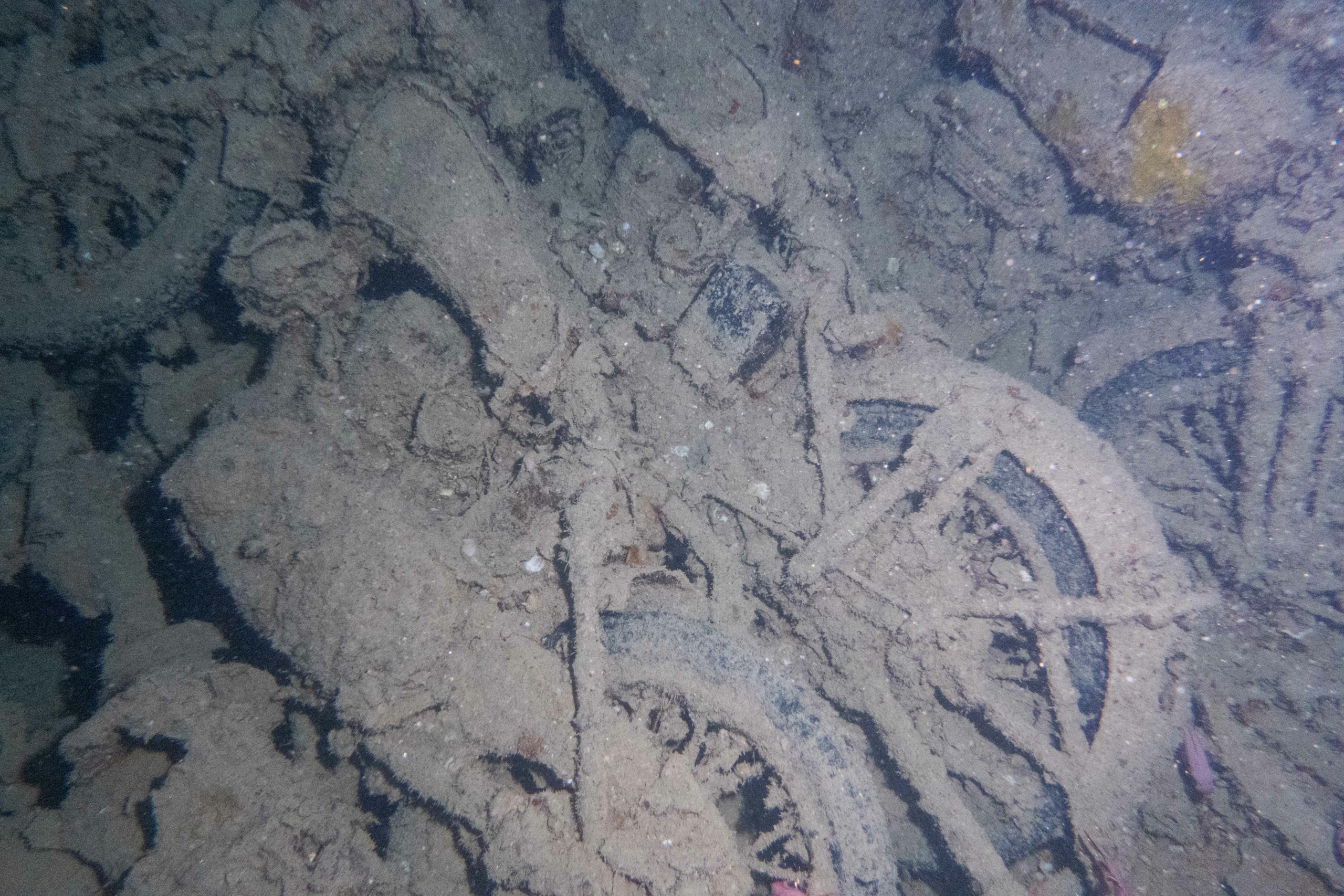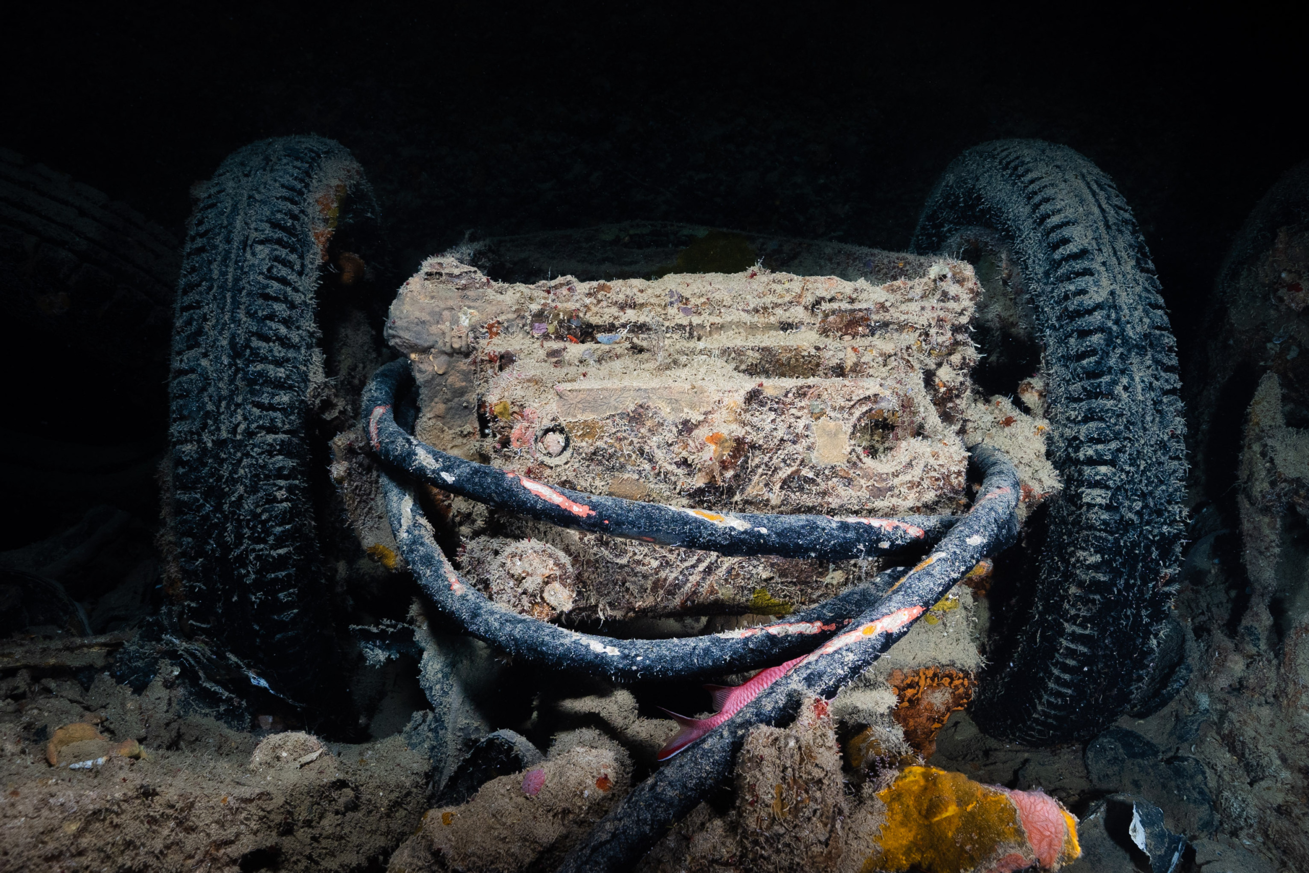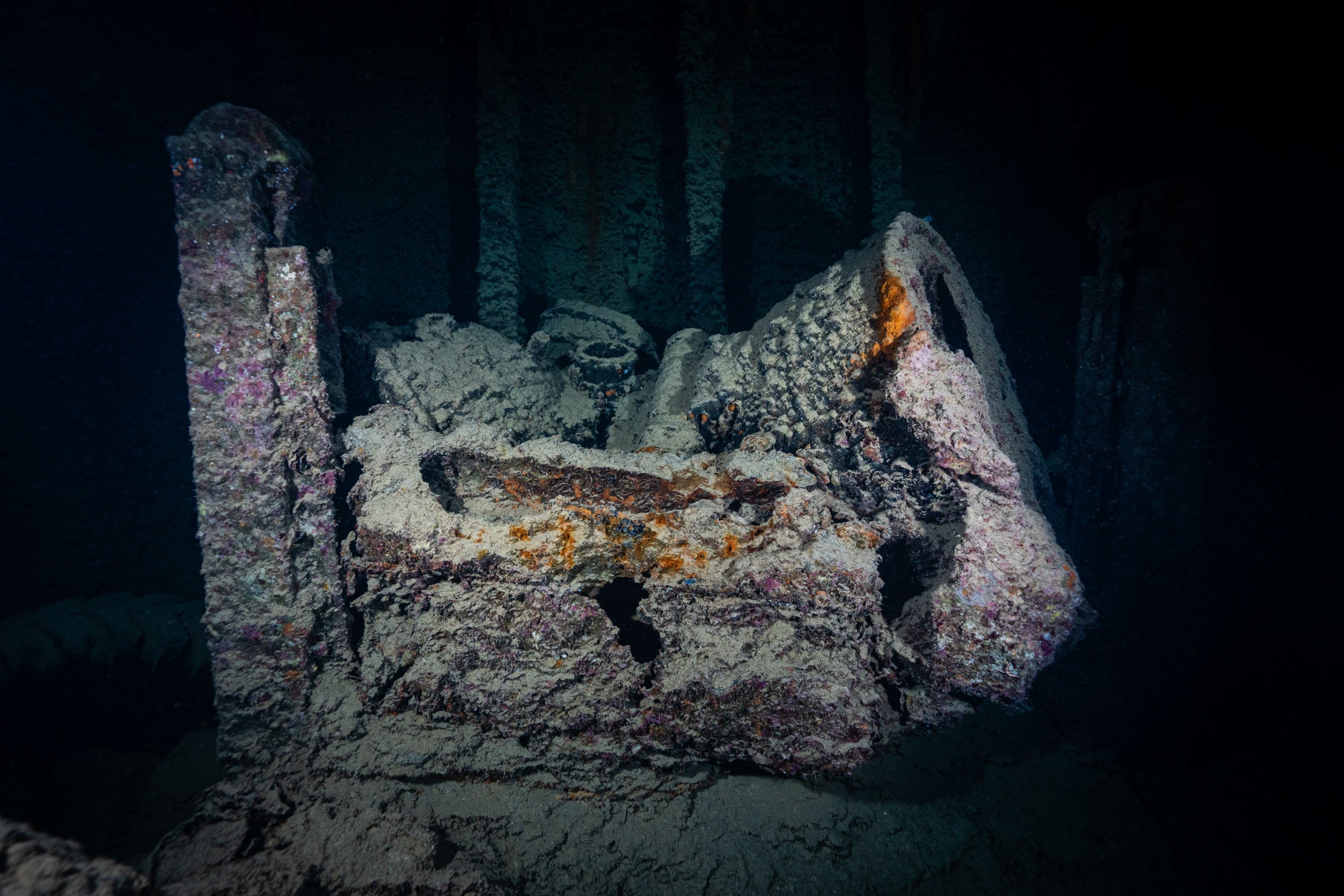 Auf diesem Tauchplatz herrscht eigentlich immer Strömung, weshalb man sich an einer Strömungsleine zum Wrack hinunterzieht. Mir wird nun klar wieso ich noch nie ein Bild der Thistlegorm von außen gesehen hatte – die Sicht ist ziemlich schlecht, überall fliegen Schwebeteilchen herum, das komplette Schiff ist absolut nicht sichtbar. Wir penetrieren es über die Löcher, die die Bomben hinterlassen haben und tauchen am untersten Deck in Richtung Bug. Dieses Deck ist ca. 3m hoch, es ist also genügend Platz. Wir sehen Motorräder, Lastwägen, Reifen, Schuhe, … Entgegen des Tauchplans gehen wir am Bug dann ins obere Deck hoch, scheinbar hatte Ellia genügend Vertrauen in unsere Tarierfähigkeiten, denn dieses Deck ist nur etwa 1.5m hoch, man muss also wesentlich besser auf die Tarierung Acht geben. Hier merke ich auch, dass ich noch nicht ganz so ein gutes Gefühl dafür habe wie groß die Flasche über meinem Kopf ist, ich bumpe ein paarmal mit der Flasche gegen die Decke. Gegen Ende werde ich ein bisschen nervös, ich hatte (wahrscheinlich durch die Aufregung) einen etwas höheren Luftverbrauch und habe durch die vielen Windungen und Türen schon vor einiger Zeit das Gefühl dafür verloren, wo wir uns im Wrack befinden. Doch kurz darauf erreichen wir das Ende und ich kann mit genügend Luftreserven aufsteigen. (Und selbst wenn nicht, Ingrid und Ines brauchen sowieso keine Luft, wir hatten also immer genügend Reserven mit 😛 )