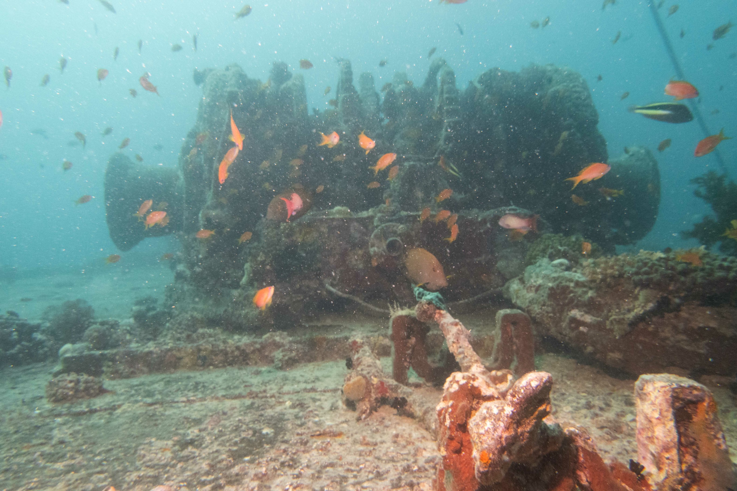 An der Thistlegorm sind wir komplett alleine, etwas was auch die Guides noch nicht erlebt haben. (normalerweise stehen hier jeden Tag bis zu 30 Boote mit Tauchern.) Die SS Thistlegorm ist ein Schiff der Briten aus dem 2. Weltkrieg, das Kriegsgut wie Panzer, Trucks, Motorräder und eine Lokomotive nach Alexandria transportieren sollte. Bei der (erfolglosen) Suche der Deutschen nach einem Truppentransport, der sich angeblich in derselben Gegend aufhielt, wurde sie entdeckt und zerbombt, woraufhin sie sank. In den 50ern wurde sie dann von Jacques Cousteau mithilfe von Fischern gefunden. Er barg einige Dinge wie den Safe des Kapitäns, Motorräder und die Schiffsglocke, die auch 1956 in National Geographics zu sehen war. Der Standort des Schiffs wurde dann aber wieder vergessen (außer von den Fischern), bis sich in den 90ern in Sharm-el-Sheik Tauchbasen bildeten und sie wiederentdeckt wurde. Sie ist unter Tauchern eines der bekanntesten Wracks überhaupt.1