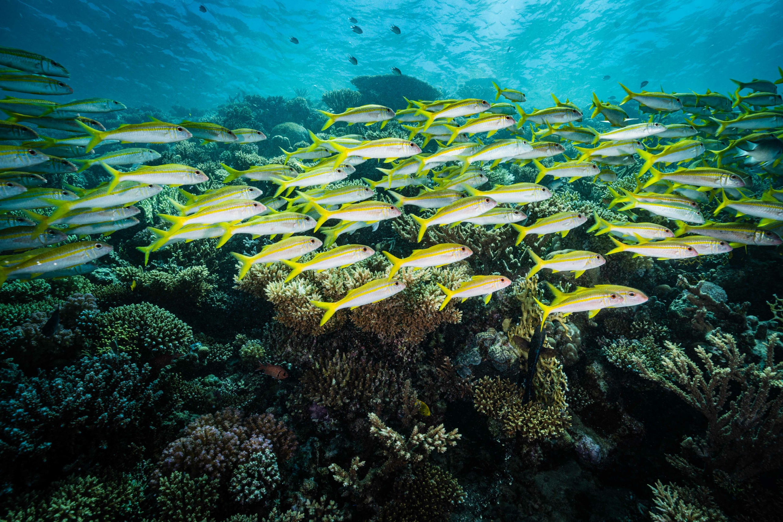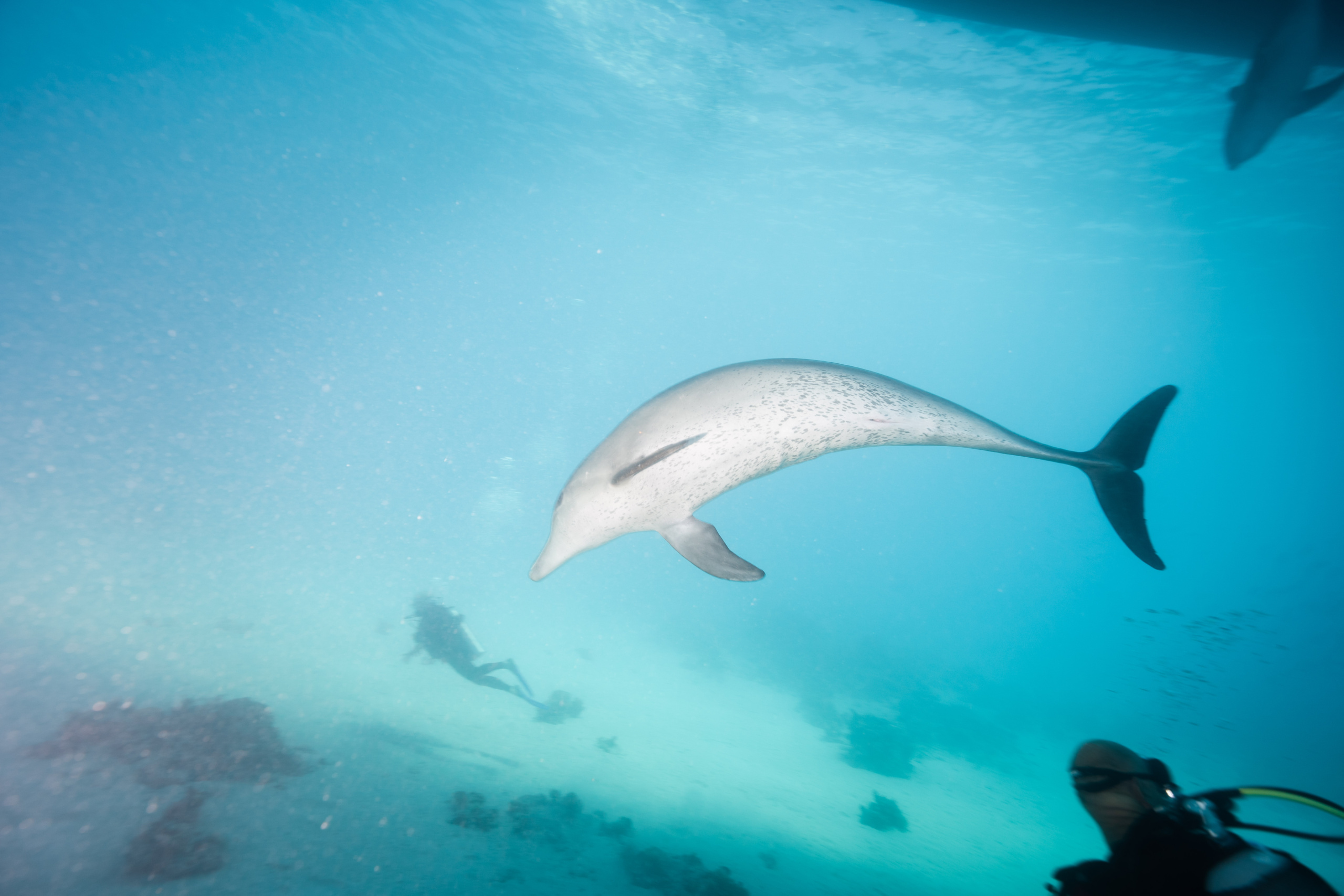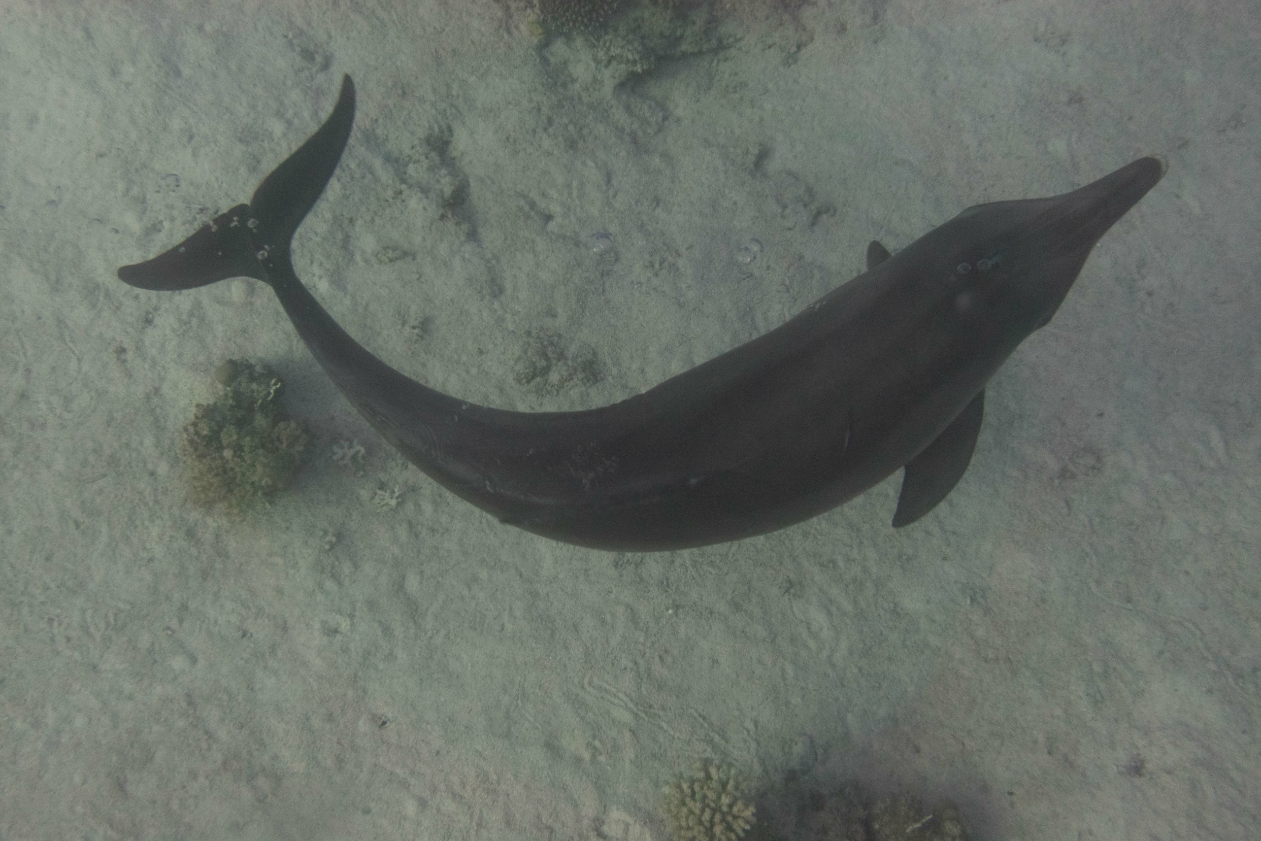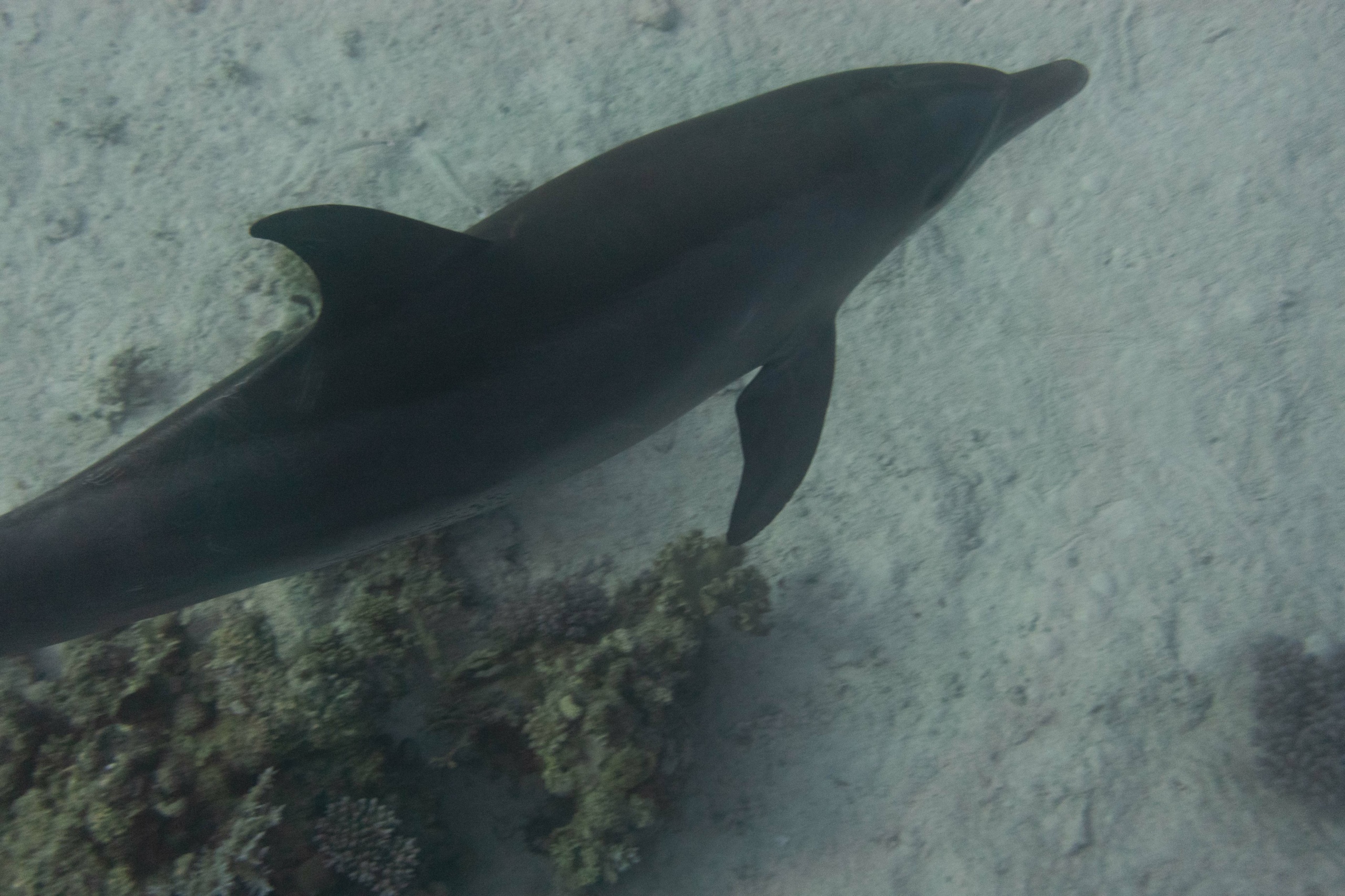 Wir tauchen an den Kanal zur Lagune, den die Delphine passieren wenn sie schlafen gehen bzw wieder aus der Lagune raus wollen. Ein Taucher aus unserer Gruppe zeigt mir eine Muräne, die ich fotografieren will, wobei ich feststellen muss dass ich meine Kamera am Vortag scheinbar schlampig zusammengebaut habe und das Objektiv nicht vollständig reingeschraubt ist. Ich kann also nicht fokussieren und daher auch keine Fotos machen. Als hätten sies gewusst, hören wir einige Sekunden später auch schon den Ruf von Delphinen, woraufhin 4 auf uns zuschwimmen. Immerhin weiß ich schon dass meine Kamera nicht funktioniert und schaue den Delphinen zu wie sie uns kurz umkreisen und nach etwa einer Minute in Richtung Lagunenausgang abhauen. Ein cooles Erlebnis, sie hätten aber auch etwas länger bleiben können 😛